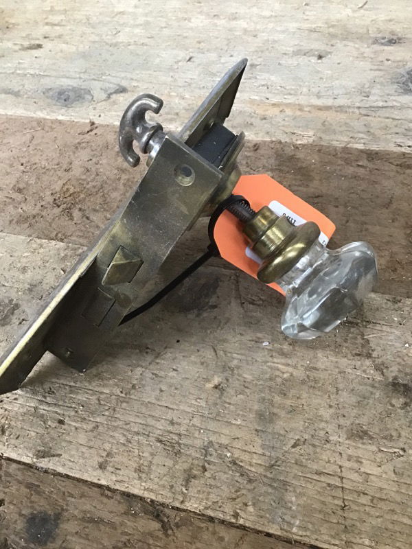 Vintage glass knob, escutcheon with lock, lever latch and spindle.