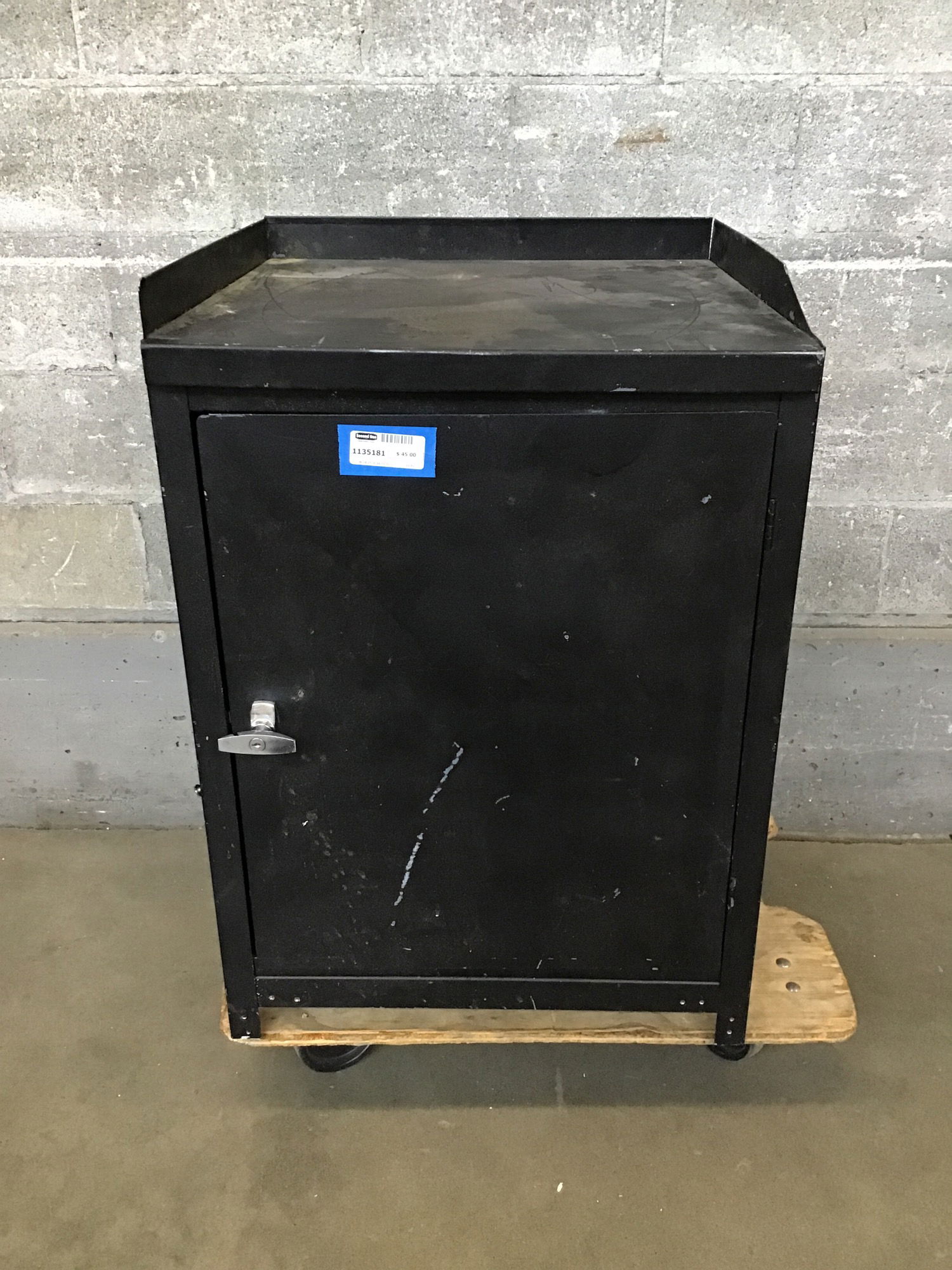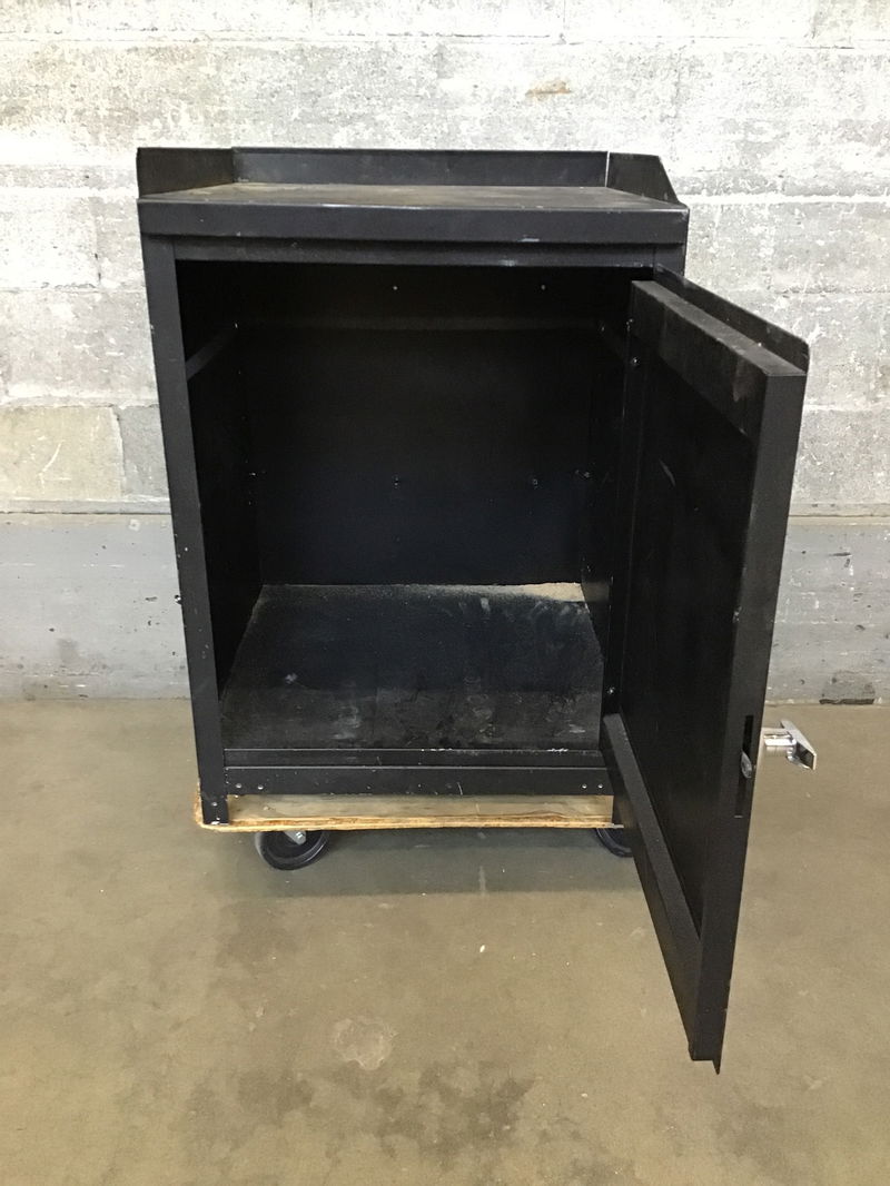 A sturdy shop cabinet made of steel and painted black. It's got one door with no shelves inside, although the top has a little lip around three of the sides for material storage. The top has a few 0.25" holes drilled into it, and there's a spot of white spray paint on the side, but it appears to otherwise be in great shape! The door has a lock on the handle, but we unfortunately do not have the key.