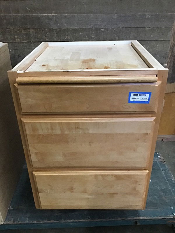 Every kitchen needs more drawers! This 3-drawer base cabinet has a Maple face on particle board box. Drawers slide well and cabinet is in good used condition. Also has a cutting board!