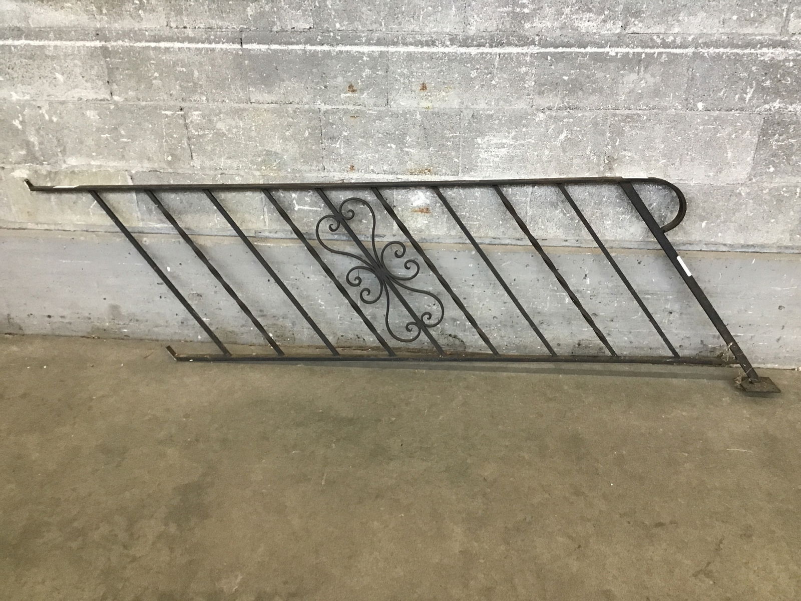 Angled run of about 7 1/2 feet of steel railing with a wrought iron look. Gaps between the vertical rails measure 5.25 inches and are not up to current building codes