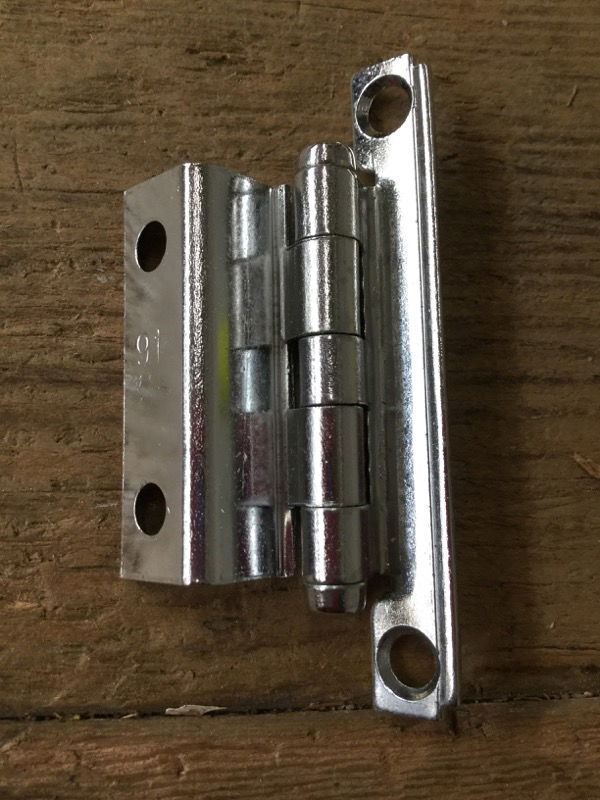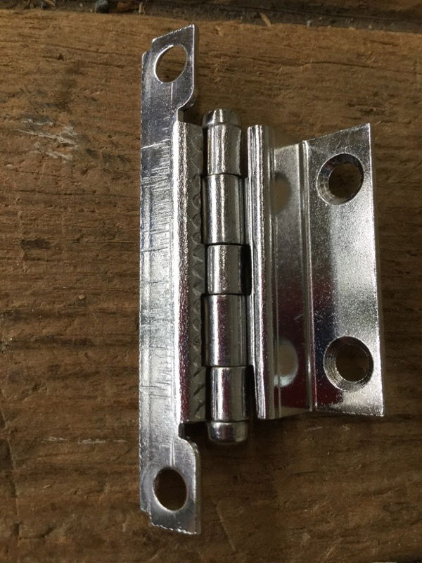 Eleven packages (each package has two hinges--enough to do one cabinet door) of new, old stock, art deco style cabinet hinges with chrome finish. Most packs still have their original screws, but some of the packs have been opened or have a hole in a corner and some screws have disappeared. Each pack does have two hinges though. Made by Washington Steel Products, Inc. of Tacoma, Washington. Label reads "1 Pr. 1013 US26" if that means anything to you. The decorative side of the hinge mounts to the cabinet face, but I'm not sure how the door side is intended to mount. You'll have to figure that part out.
