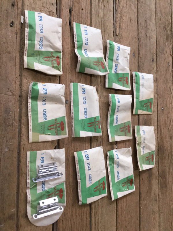 Eleven packages (each package has two hinges--enough to do one cabinet door) of new, old stock, art deco style cabinet hinges with chrome finish. Most packs still have their original screws, but some of the packs have been opened or have a hole in a corner and some screws have disappeared. Each pack does have two hinges though. Made by Washington Steel Products, Inc. of Tacoma, Washington. Label reads "1 Pr. 1013 US26" if that means anything to you. The decorative side of the hinge mounts to the cabinet face, but I'm not sure how the door side is intended to mount. You'll have to figure that part out.