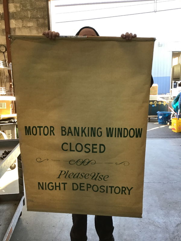 Here's a conversation piece for your wall! This hand painted banner reads "MOTOR BANKING WINDOW CLOSED Please Use NIGHT DEPOSITORY" What a random thing to have! It was made by the Illinois Shade Division of the Slick Industrial Company in Chicago, probably in the 1950's.