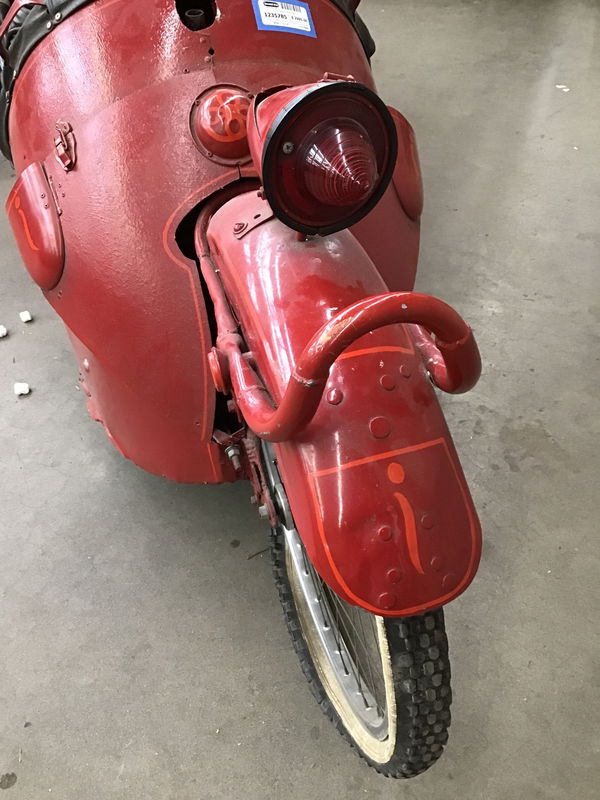 Amazing, bespoke, Red Bike Car that appears to have a custom, sculptural housing crafted around a three wheeled bike. My guess is that at some point it actually functioned but now needs some major structural TLC to get back to racing shape. The tires are flat and its internal gear situation is questionable, BUT it is still a fantastical thing of beauty with its red paint and custom pinstriping, it will be a labor of whimsical love to restore this!