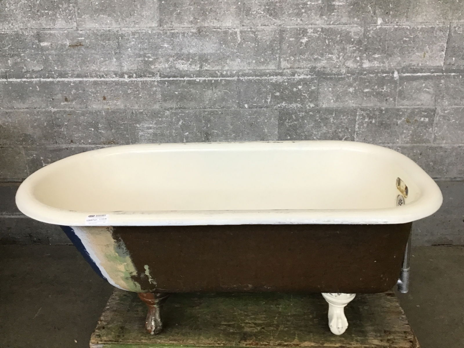 5' clawfoot tub that has literally been hammered extensively along one of its edges and has a terrible peeling refinish job going on. Great as a planter at this point and, hey, it has all 4 feet!