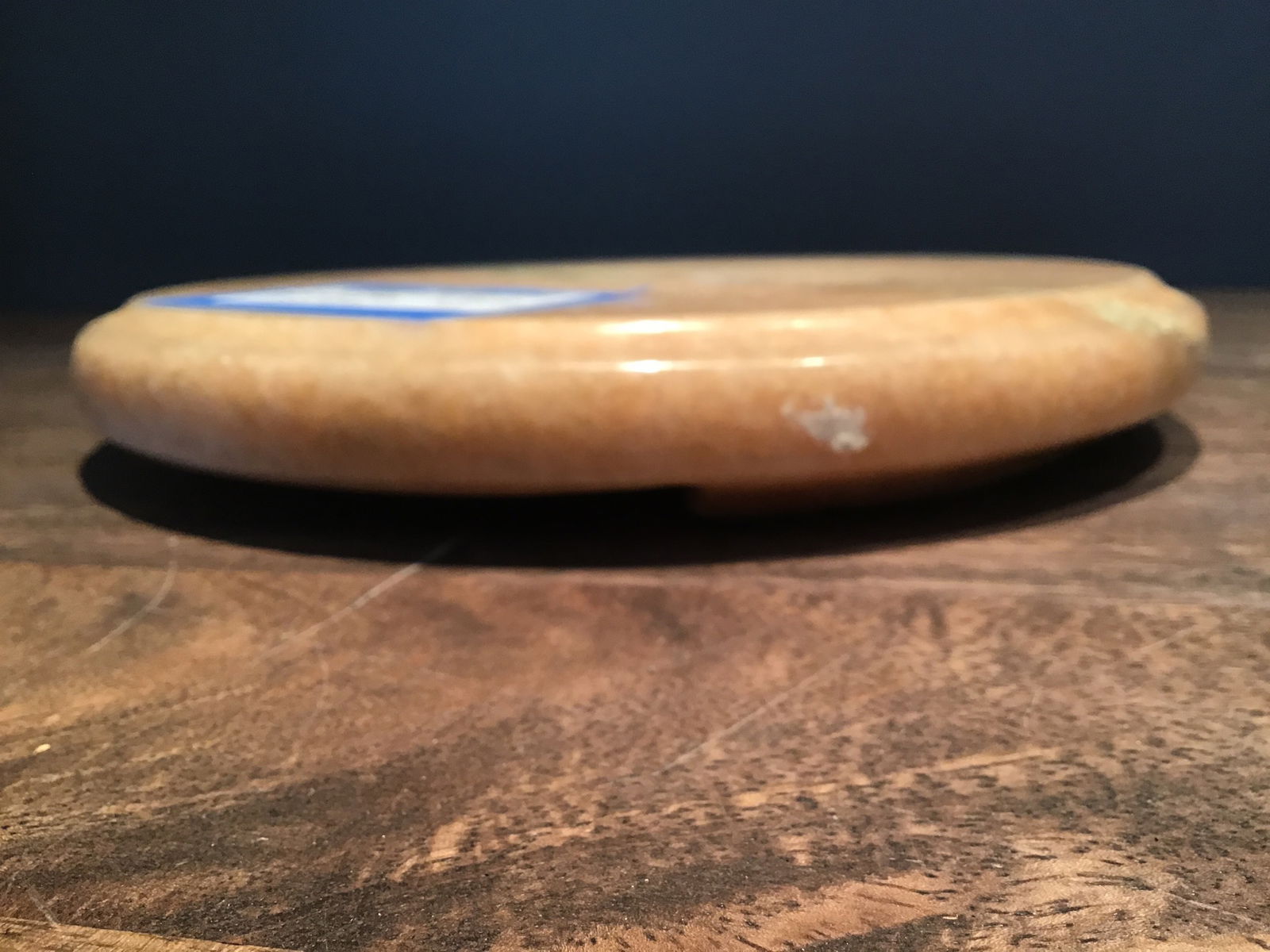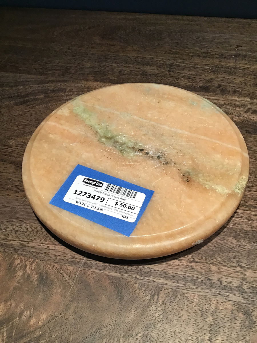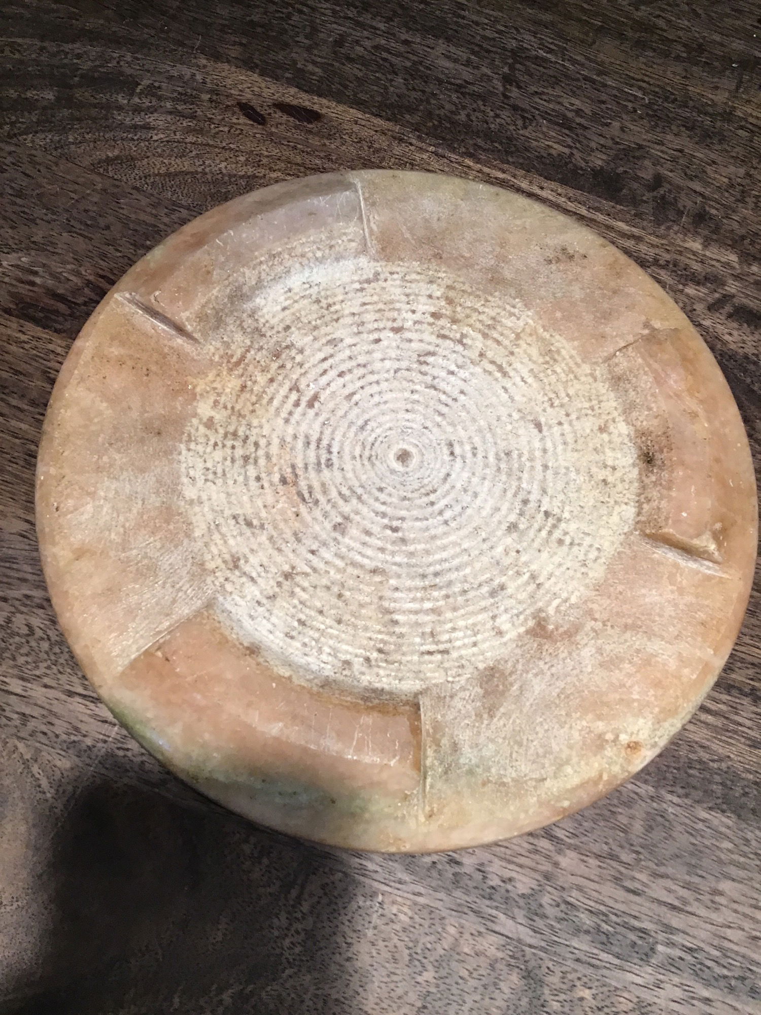 A nice looking old peach colored round plate, which appears to be used for rolling a traditional Indian bread called Chapati. Good amount of heft and has a cool circular design on the underside. Has little feet on the bottom to raise it off the ground.