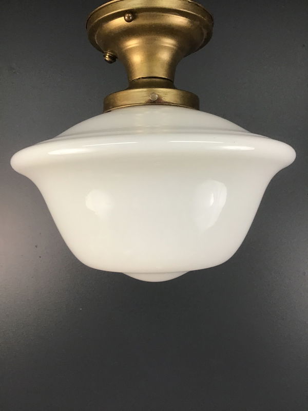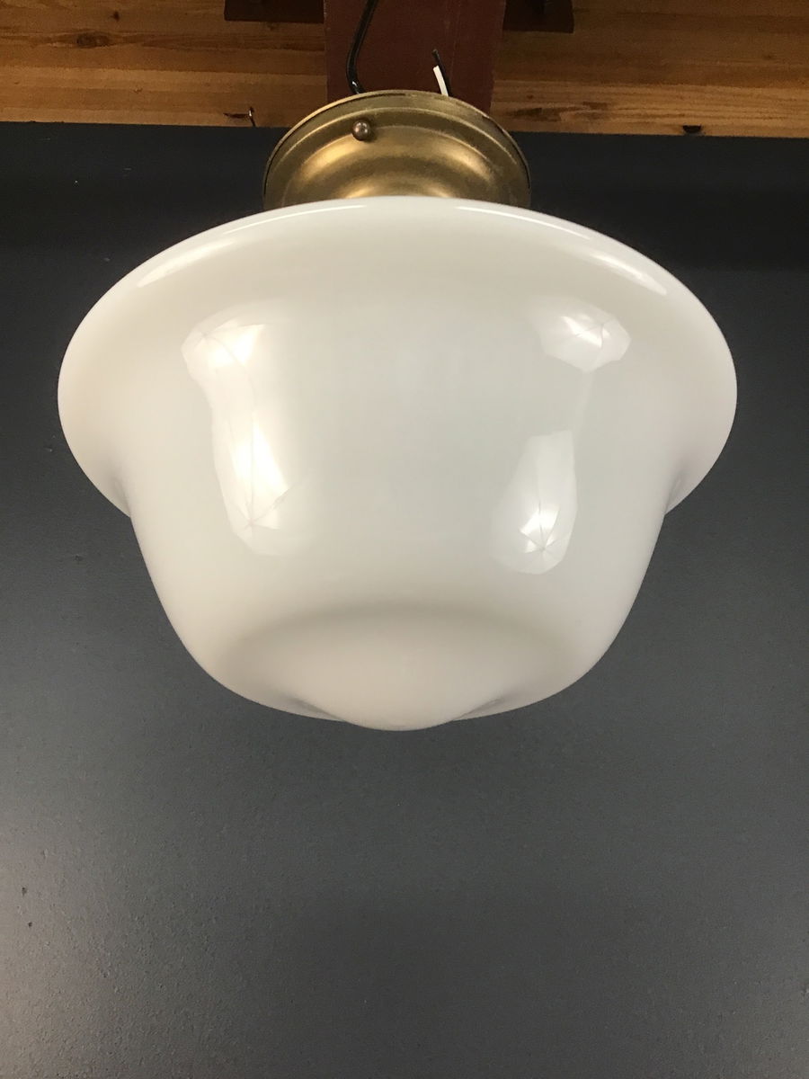 A 12" white glass Schoolhouse globe hangs from a brass semiflush base. Restored in our on site light repair workshop