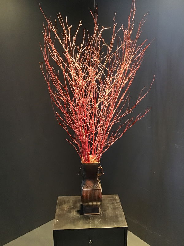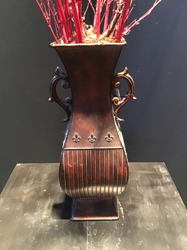 Add a touch of red and nature at the same time with this metal pot filled with branches. They seem to be real branches painted red and filled with moss and twigs on the bottom. Comes in a regal metal pot with elegant handles and fleur-de-lis around it.