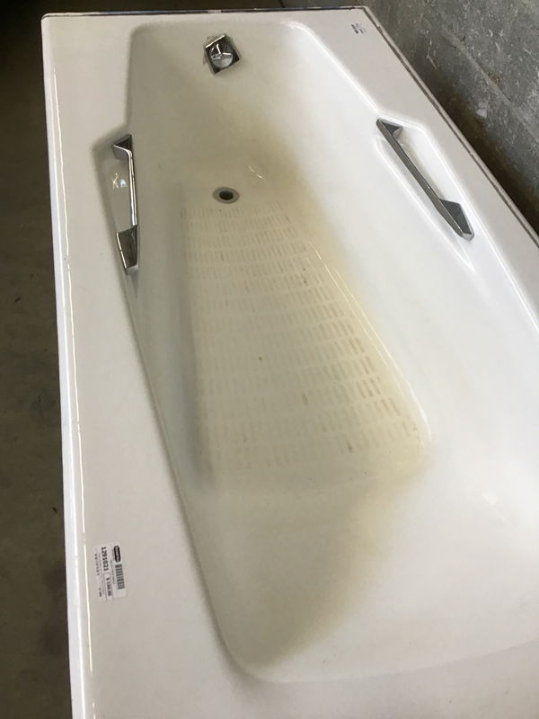 Drop-in style Kohler cast iron tub. A little bit of leftover caulking to remove around the edges. In pretty good shape.