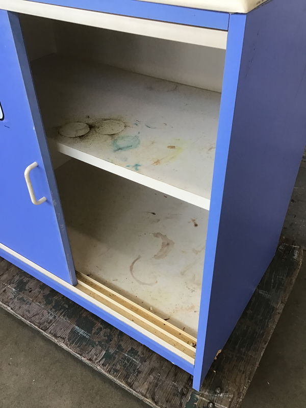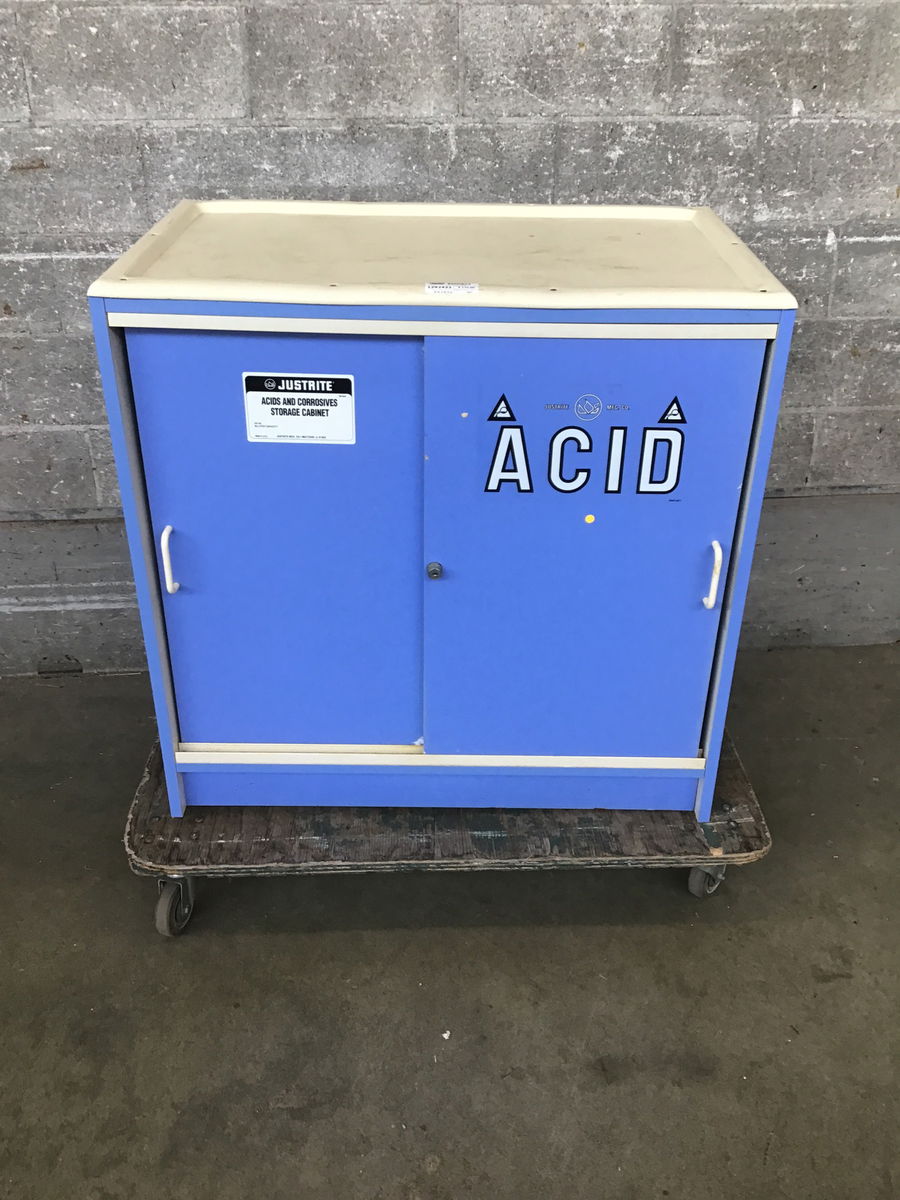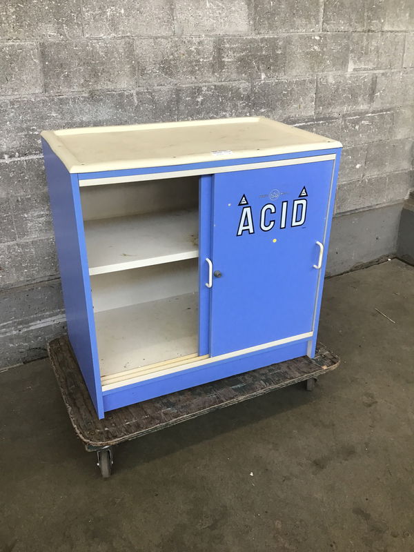 This is a plastic laminate acid storage cabinet used in a middle school science lab. Has a sturdy plastic top that can serve as a work space or more storage.