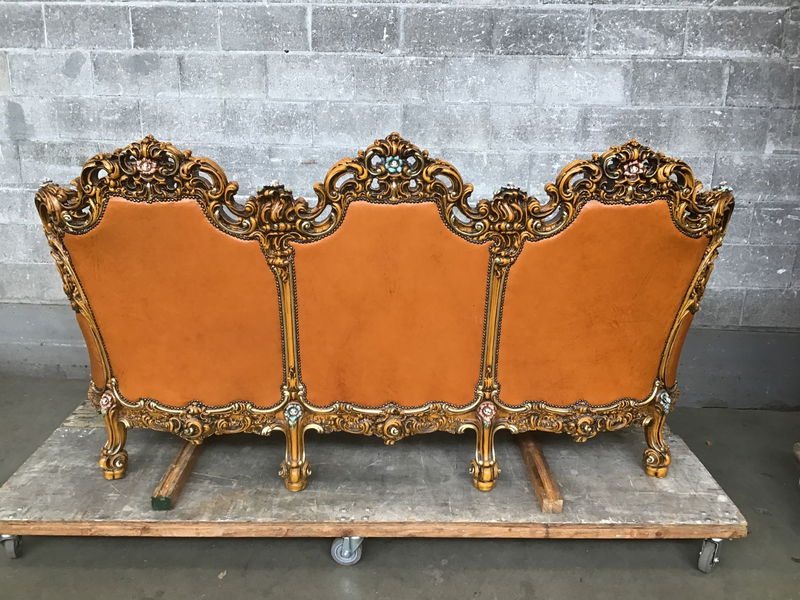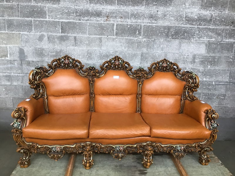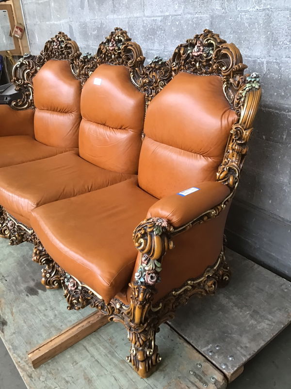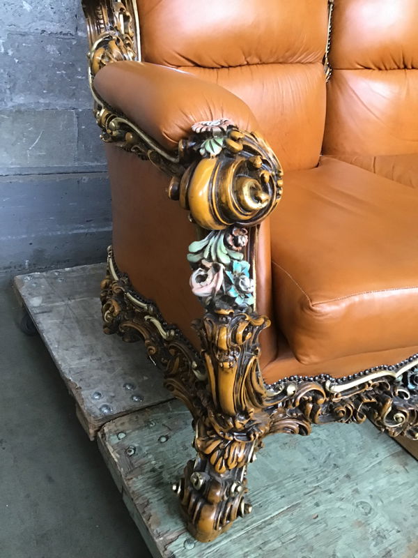 Where do I even begin?! This impossibly fantastical couch was handmade in Italy according to the supplier. Everything from the incredible Rococo scrollwork and floral details, to the burnt sienna leather upholstery was painstakingly crafted by hand. Not only does this couch catch the eye, but is also quite comfortable to boot!