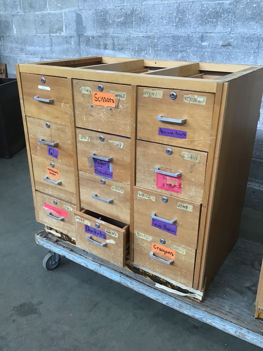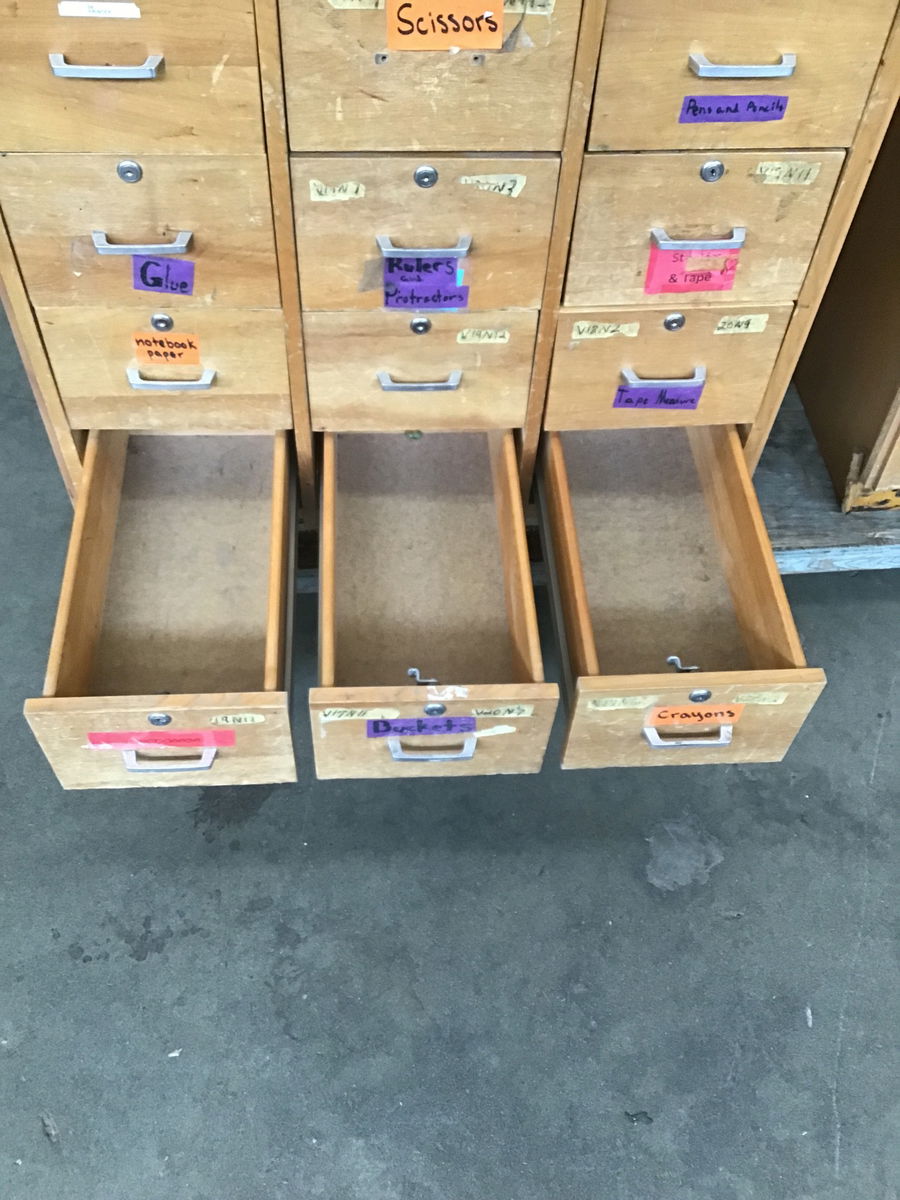 Formerly used in a local middle school, this birch cabinet has 12 drawers, brushed chrome pulls and the wear n' tear you'd expect from consistent use by tweens. Would be a great addition to your shop or craft room! No keys included.