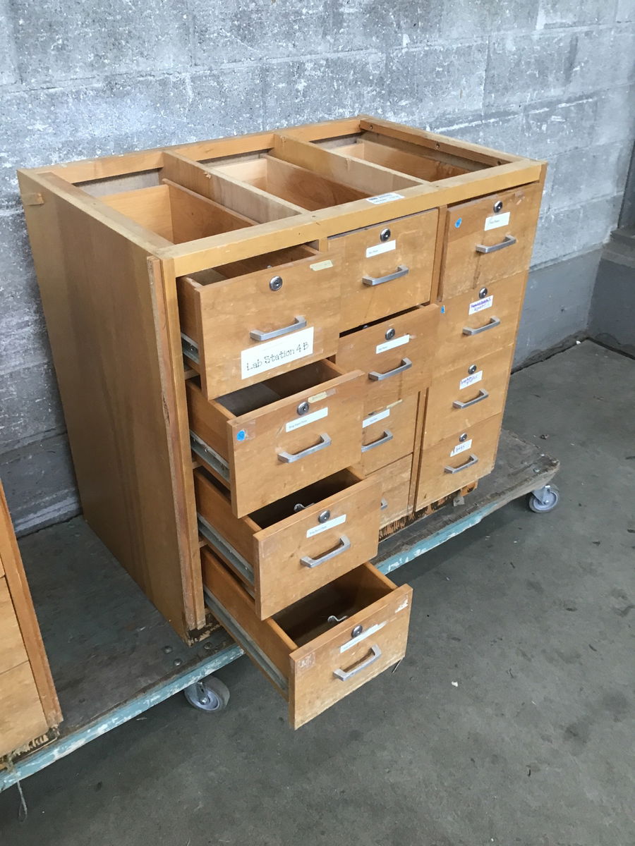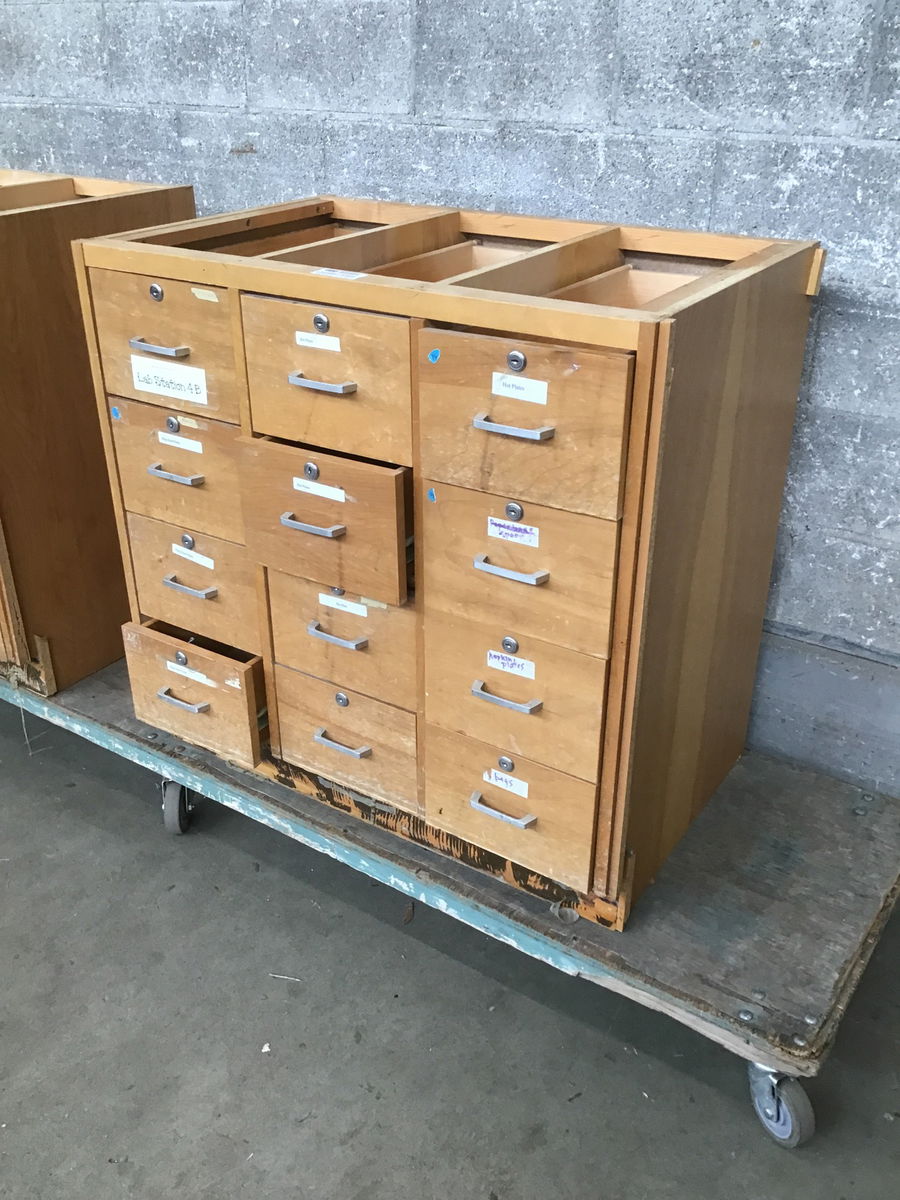 Formerly used in a local middle school, this birch cabinet has 12 drawers, brushed chrome pulls and the wear n' tear you'd expect from consistent use by tweens. Would be a great addition to your shop or craft room! No keys included.