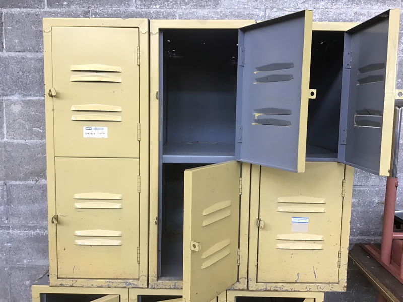 This bank of 6 lockers comes in a very nice mustard yellow color. They are originally from a local middle school. Some fasteners are missing in the back so it will need to be reassembled before use. CAUTION: the lockers are not fully attached to each other in the back. We've applied tape as a temporary fix.