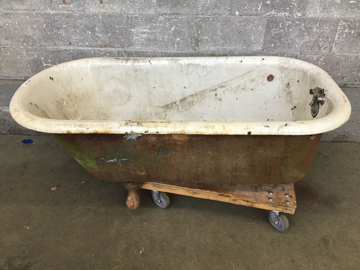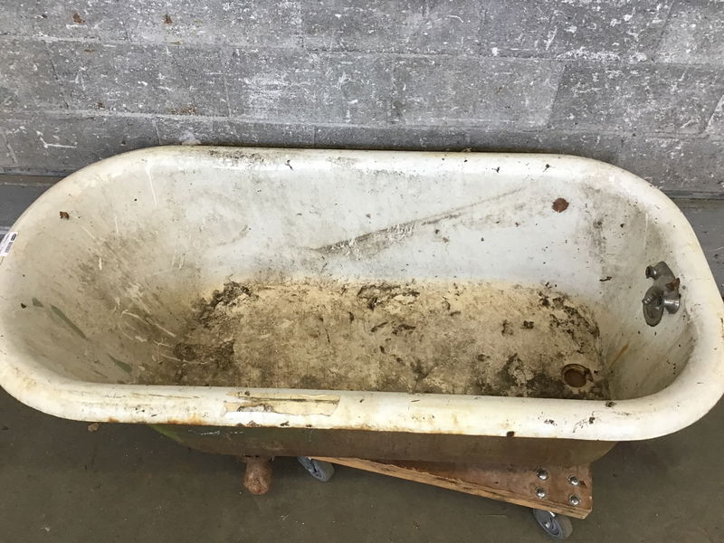 Deeply stained and dirty 5' clawfoot tub with two rusted on feet, great gardening tub or yard art classic.