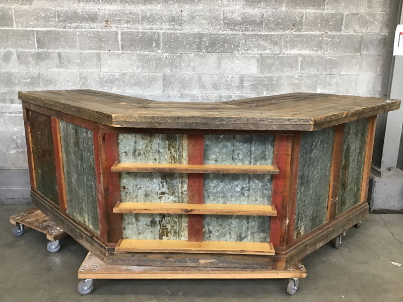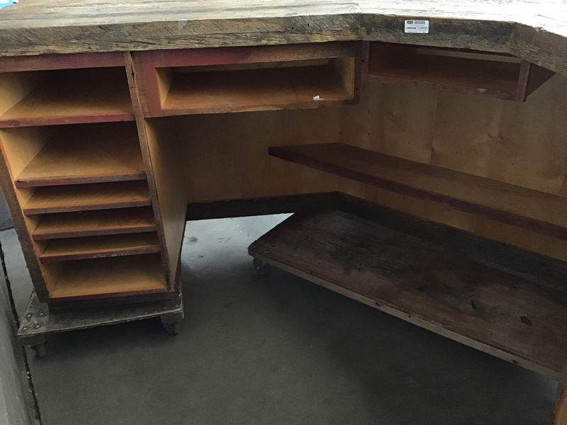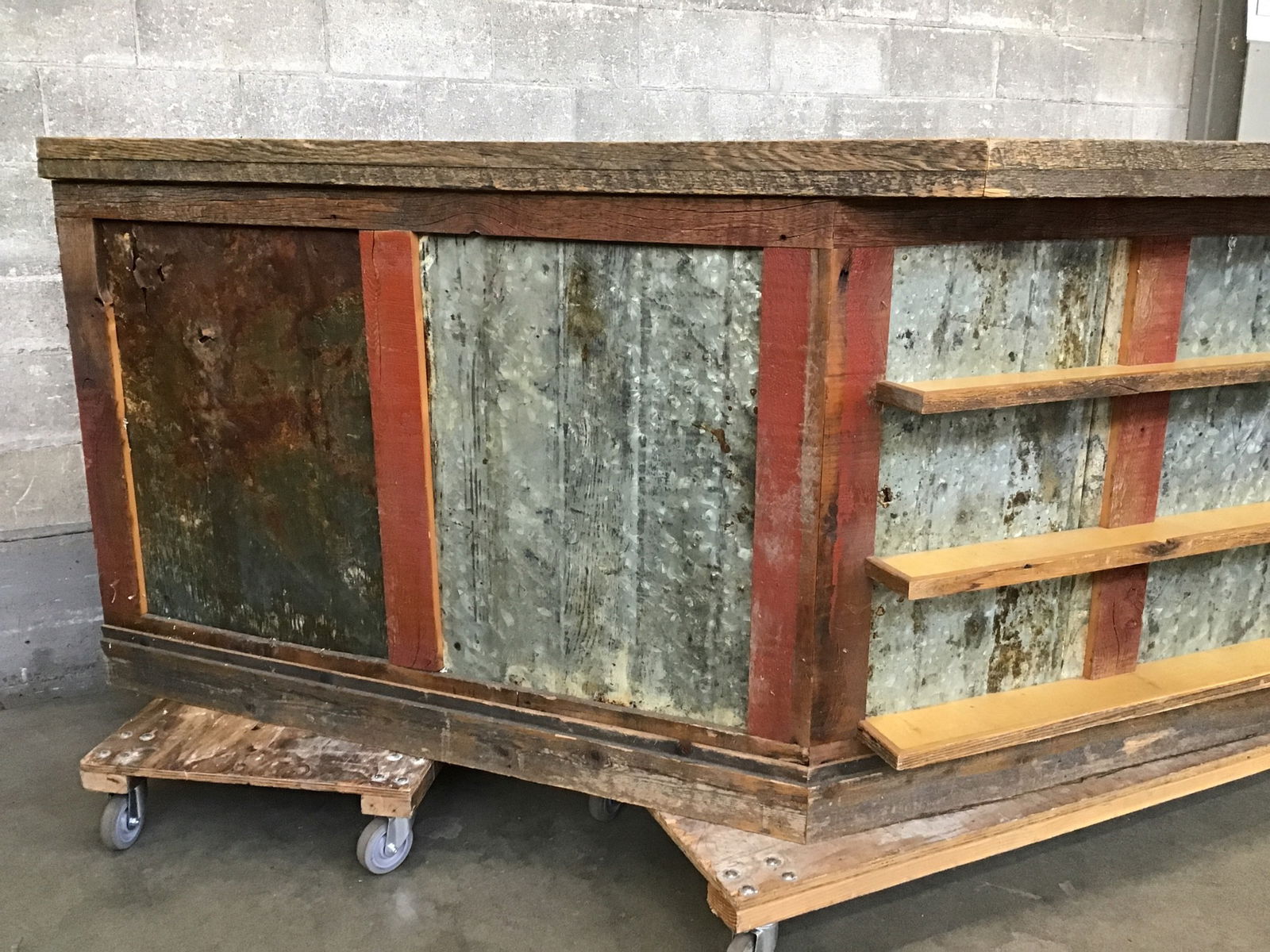 Custom-made service counter from a local apple orchard with barn wood, plywood and corrugated steel construction. Features super chunky fir countertop, cutie exterior display shelving, lots of interior storage, and a great patina that comes from many years of apple consumption and camaraderie. Would make an amazing rustic home bar!