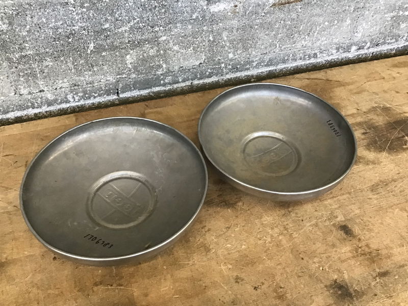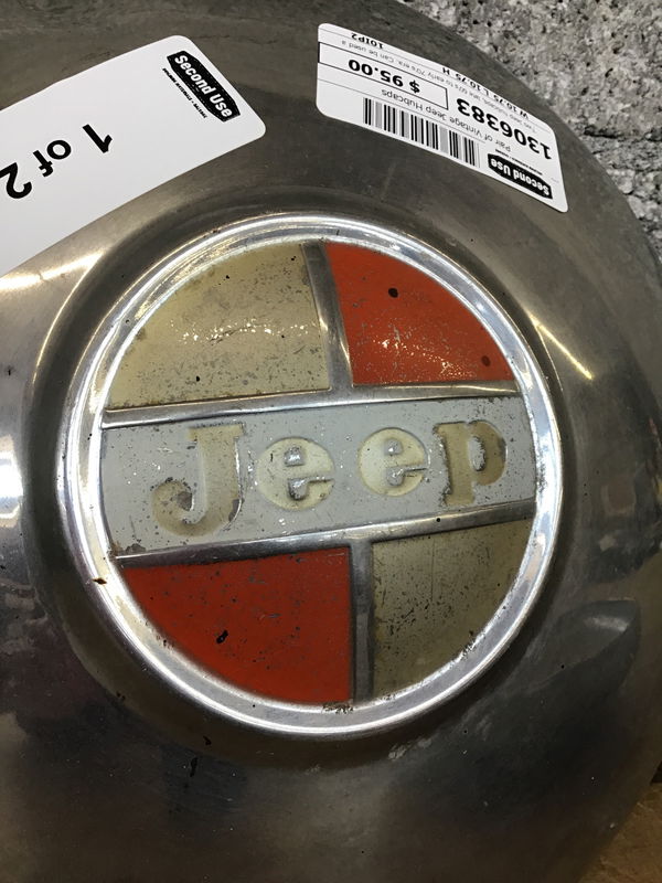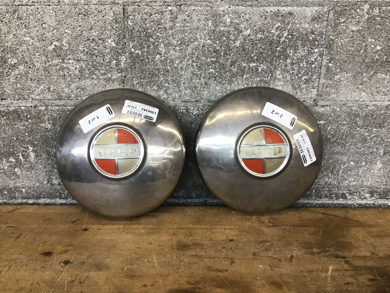Two Jeep hubcaps, late 60's to early 70's era. Can be used as fancy dog bowls if nothing else!