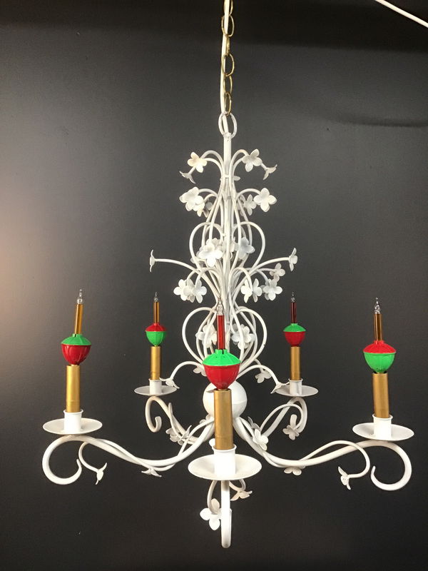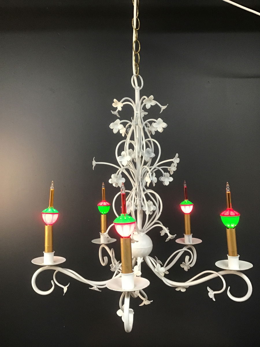 A vintage Italian floral chandelier that has been painted white with brass accents, holds 5 bubble lights for a little holiday cheer! Comes with 14' of white cord with a switch and plug. After the season is over, just swap out the light bulbs for the next holiday!