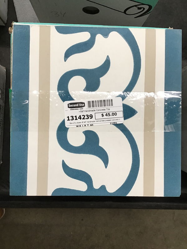 Box of a dozen 8"x8" handmade Vietnamese pressed concrete tiles. Just over 5sf total. Great for flooring, backsplashes, and more. Info here. See similar ones selling here for $15/sf or $6.90 per tile.