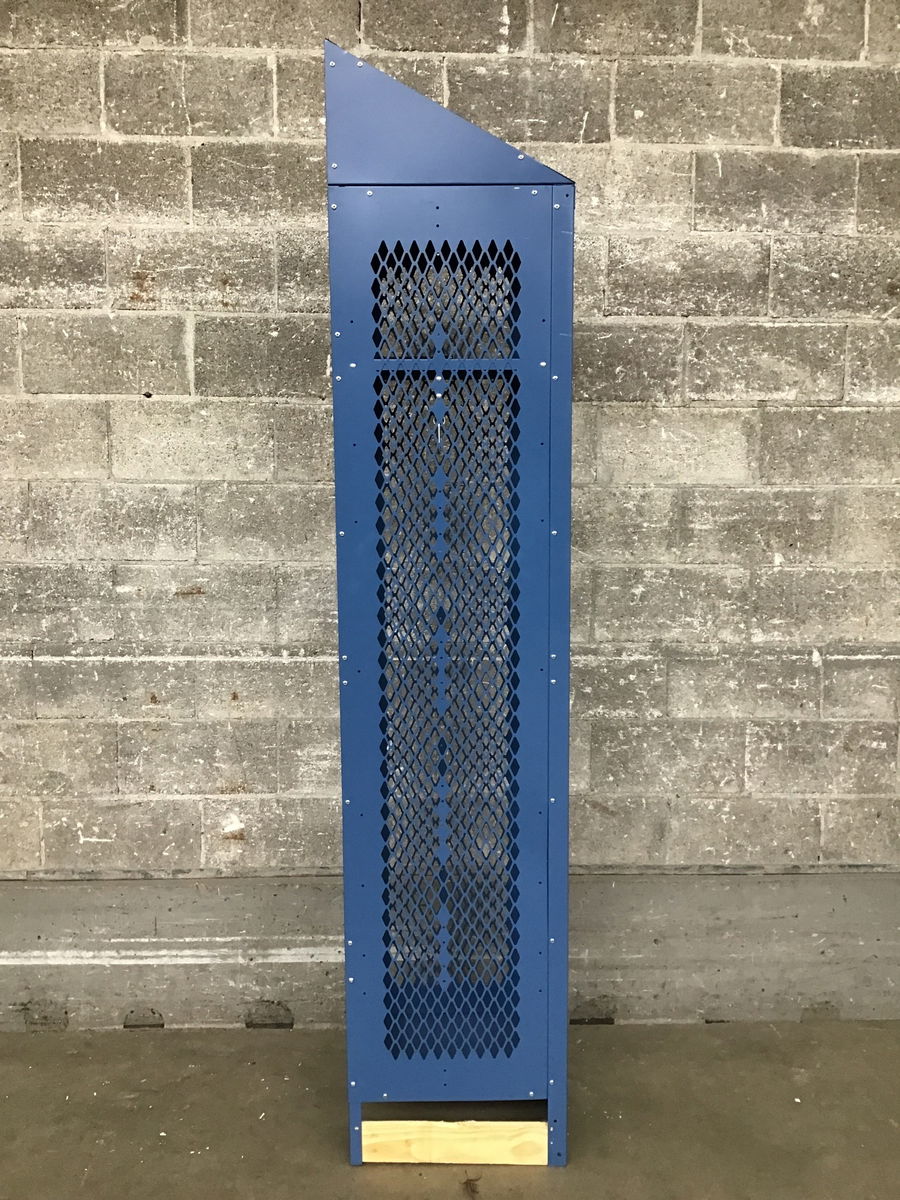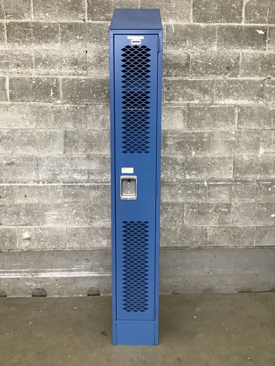 Modern, well-made single bank locker with perforated steel panels, a single shelf, various hooks and a space for a padlock. This one has a slanted top to prevent those sneaky kiddos from putting things on top of it.
