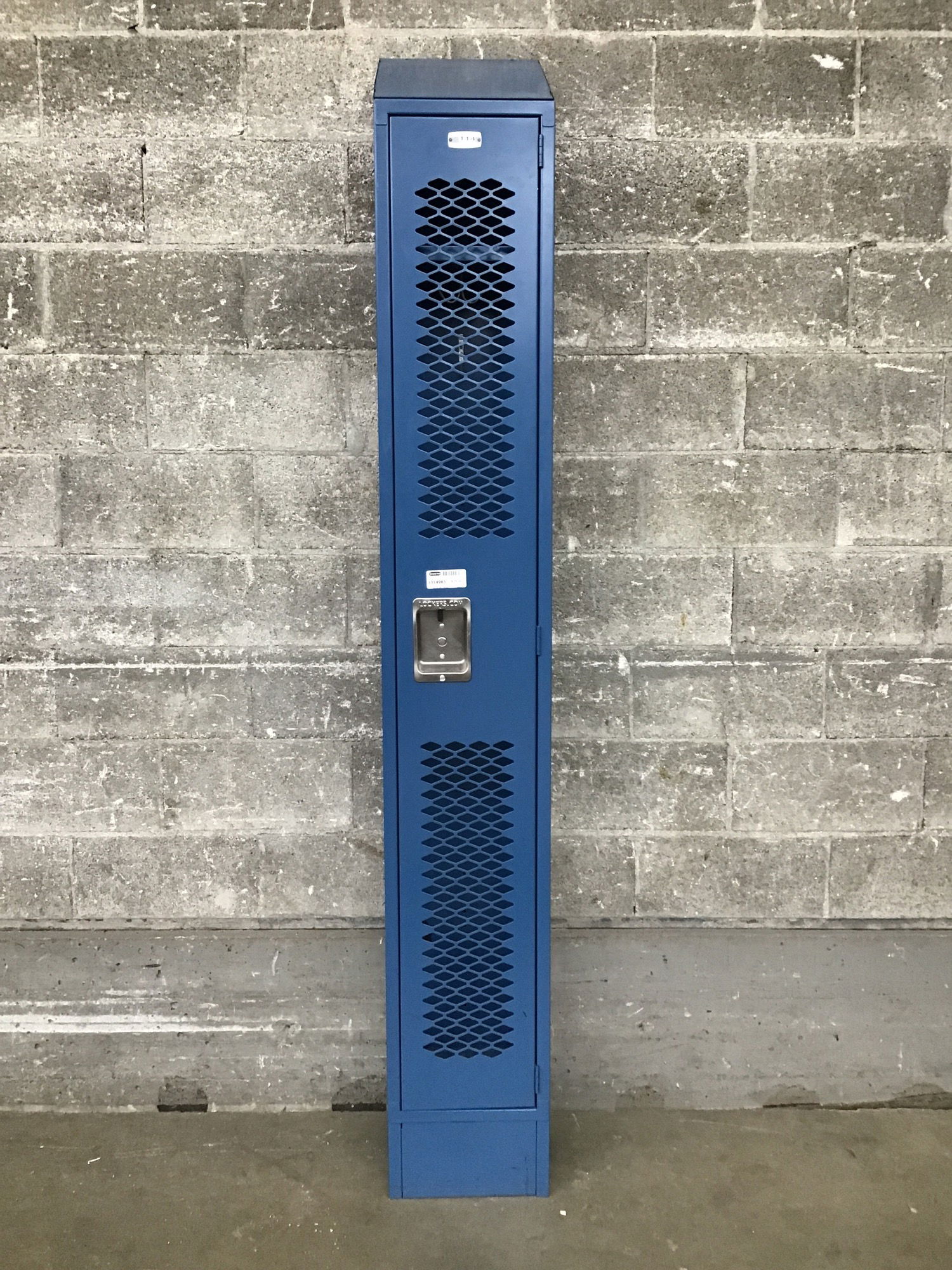 Modern, well-made single bank locker with perforated steel panels, a single shelf, various hooks and a space for a padlock. Has a slanted top to prevent those sneaky kiddos from putting things on top of it.