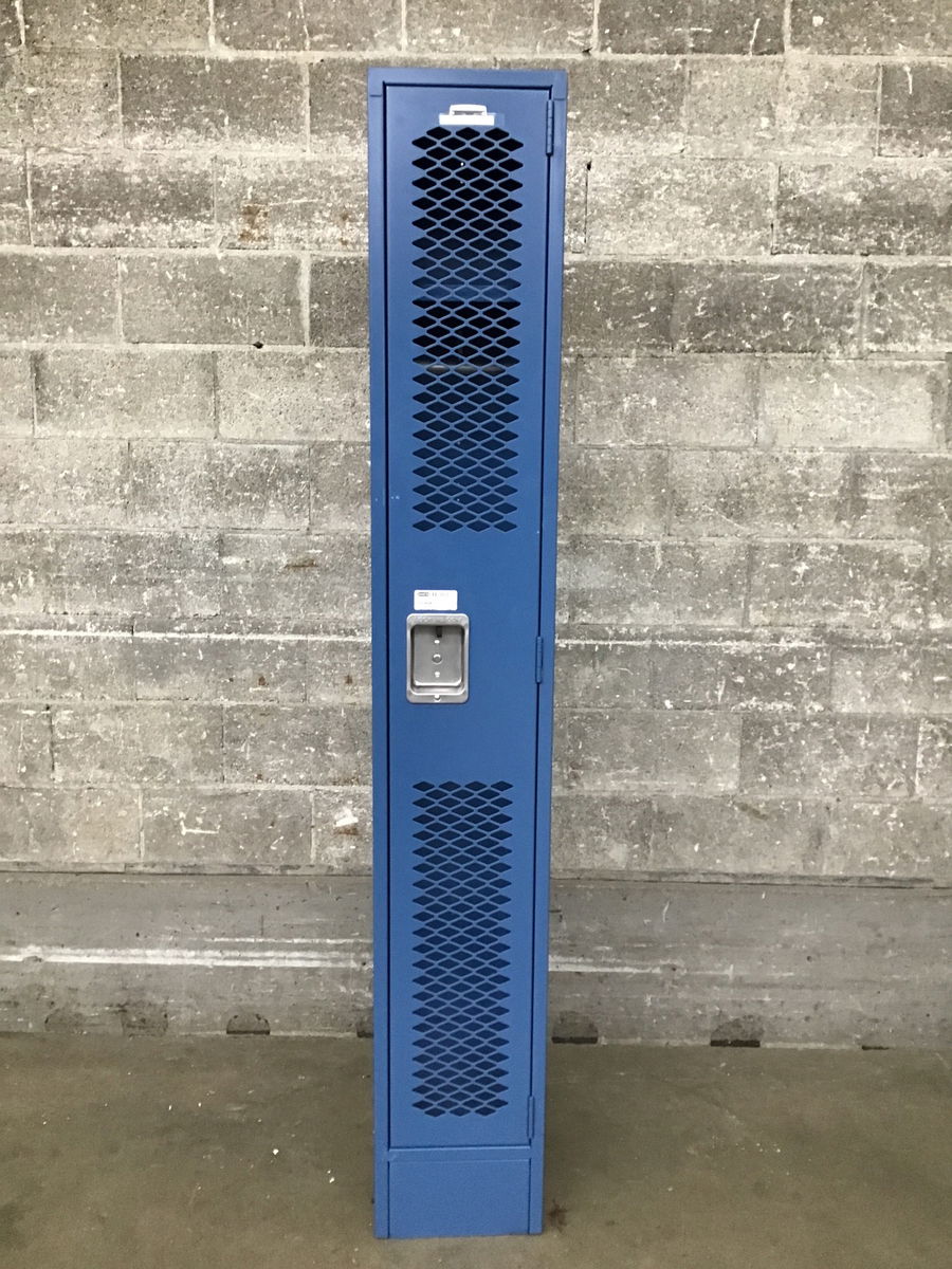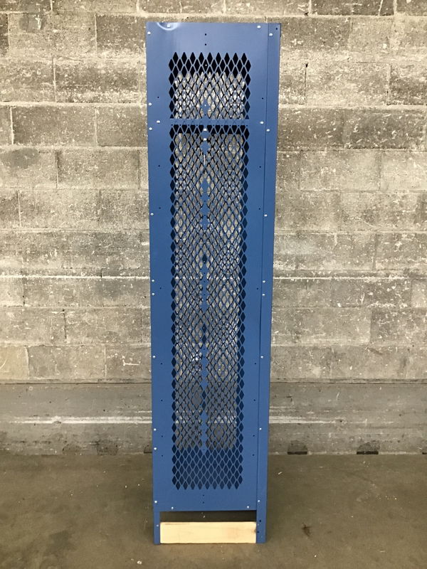 Modern, well-made single bank locker with perforated steel panels, a single shelf, various hooks and a space for a padlock.