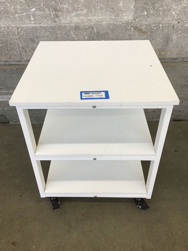 This is a short white table with 2 surfaces on a metal frame. Rolls on four locking casters.