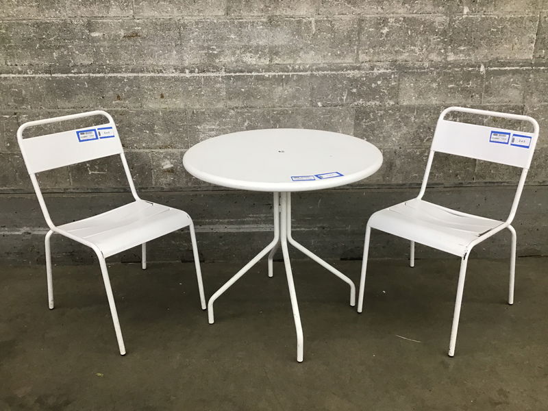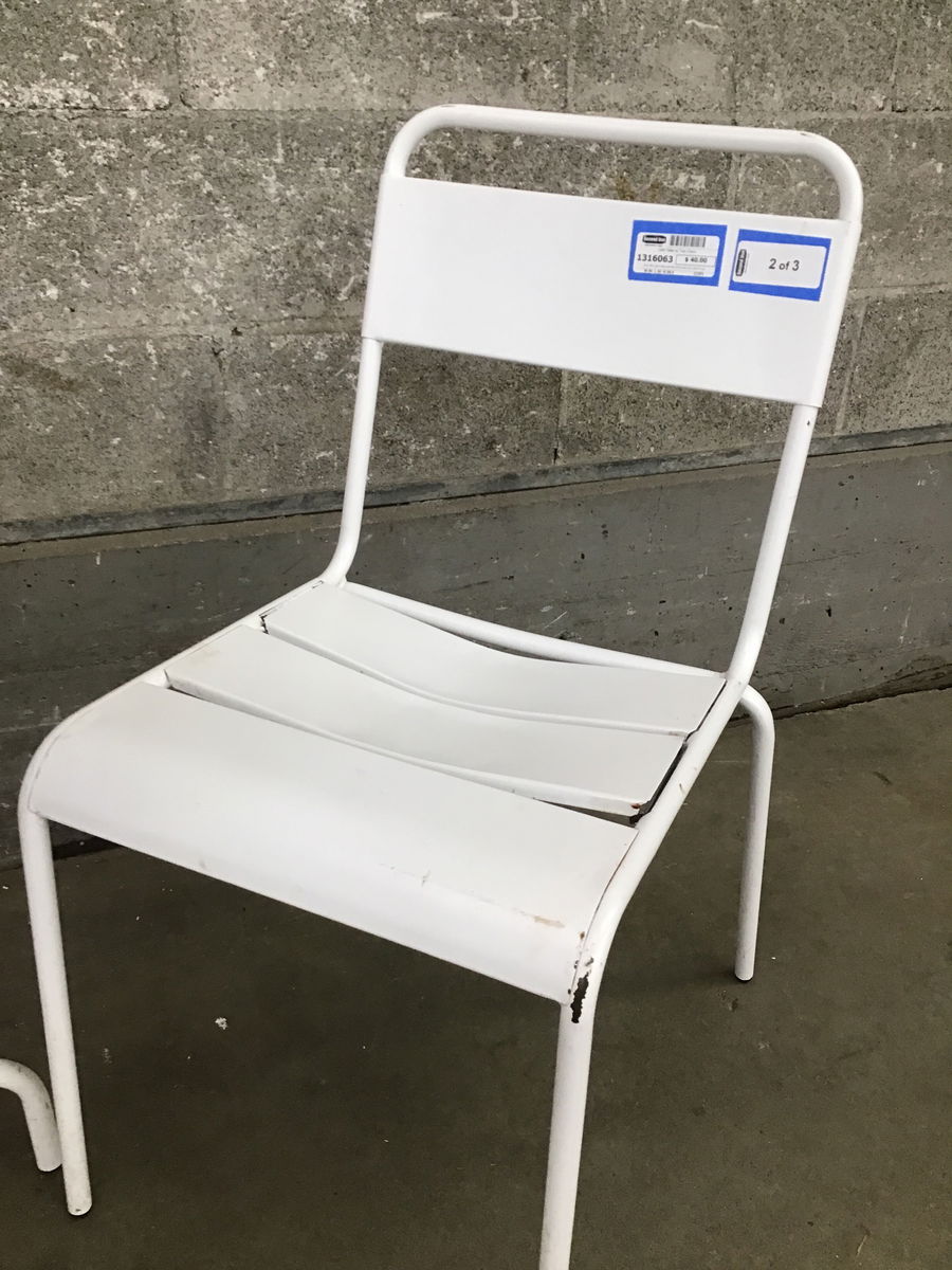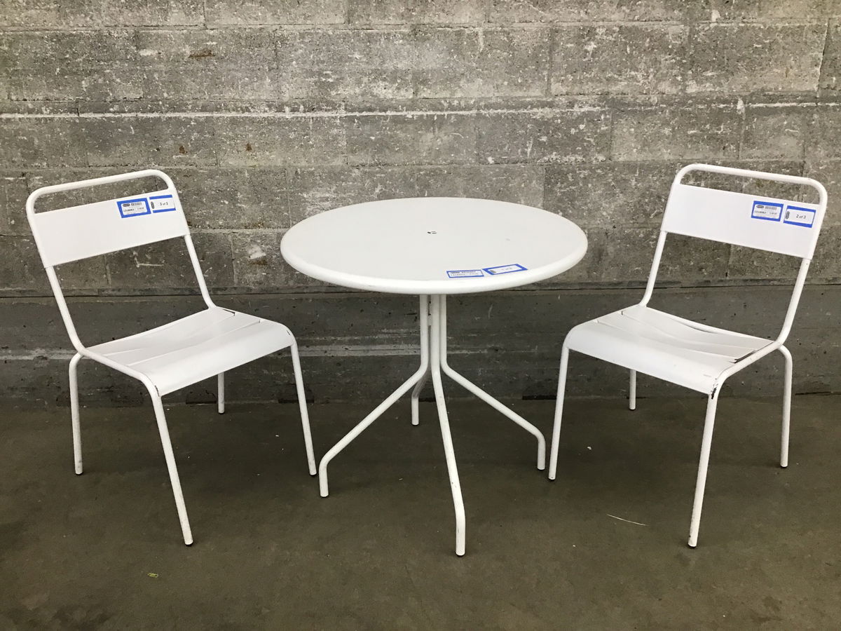 Nice little patio table painted white with two chairs to go with. Chairs have seen better days and the welds are separating in a couple spots, price reflects. Dimensions listed are for the table.