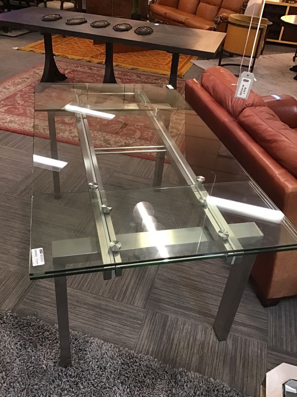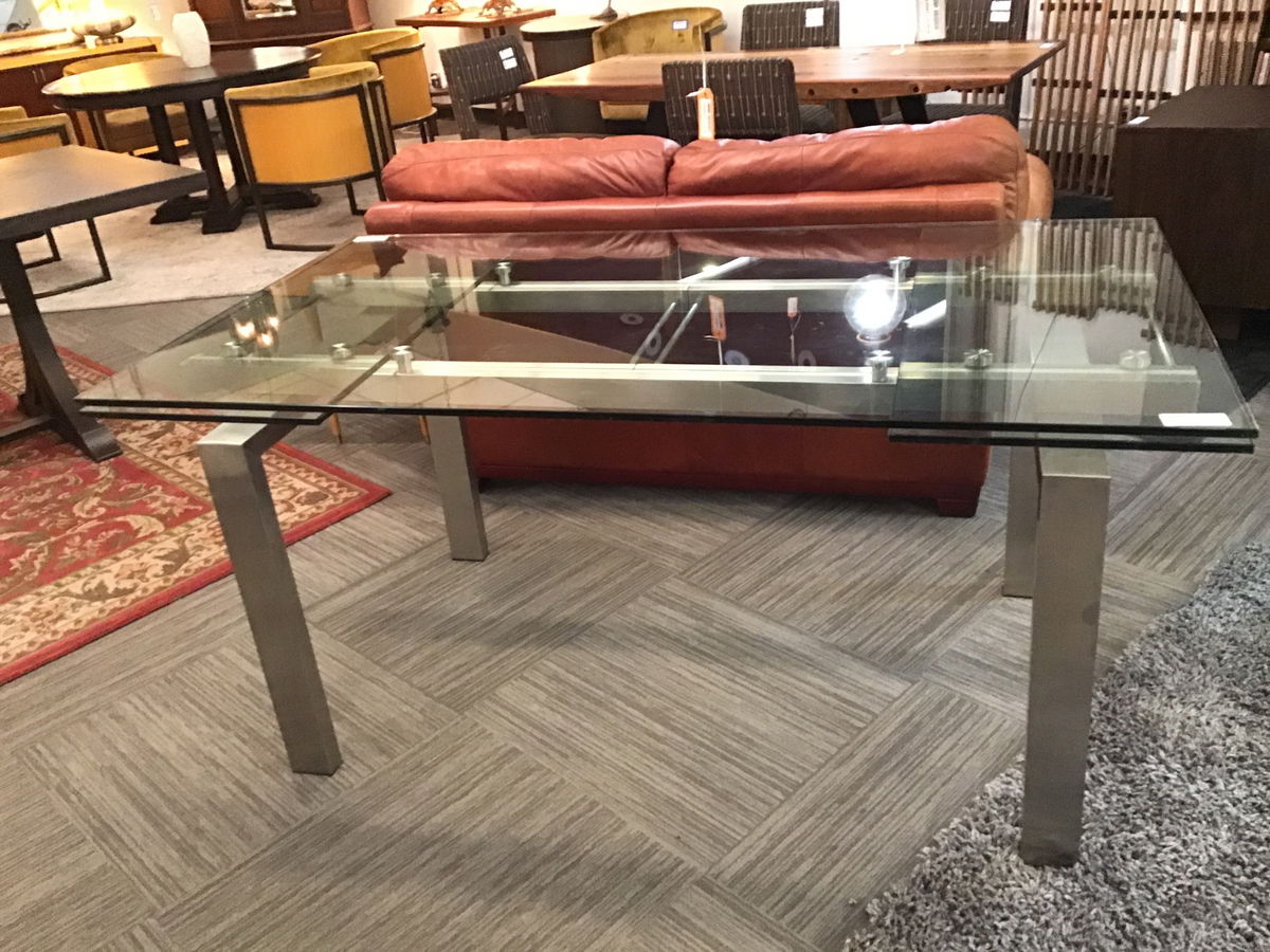 Glass kitchen table that features two built-in extension leaves that pull out when you need room for a few more at the table. There are a few light scratches on the 1/2" thick tempered glass but it's free of chips. The base is steel in a satin finish. Extends to 94.625" long. Full product specs available here.
