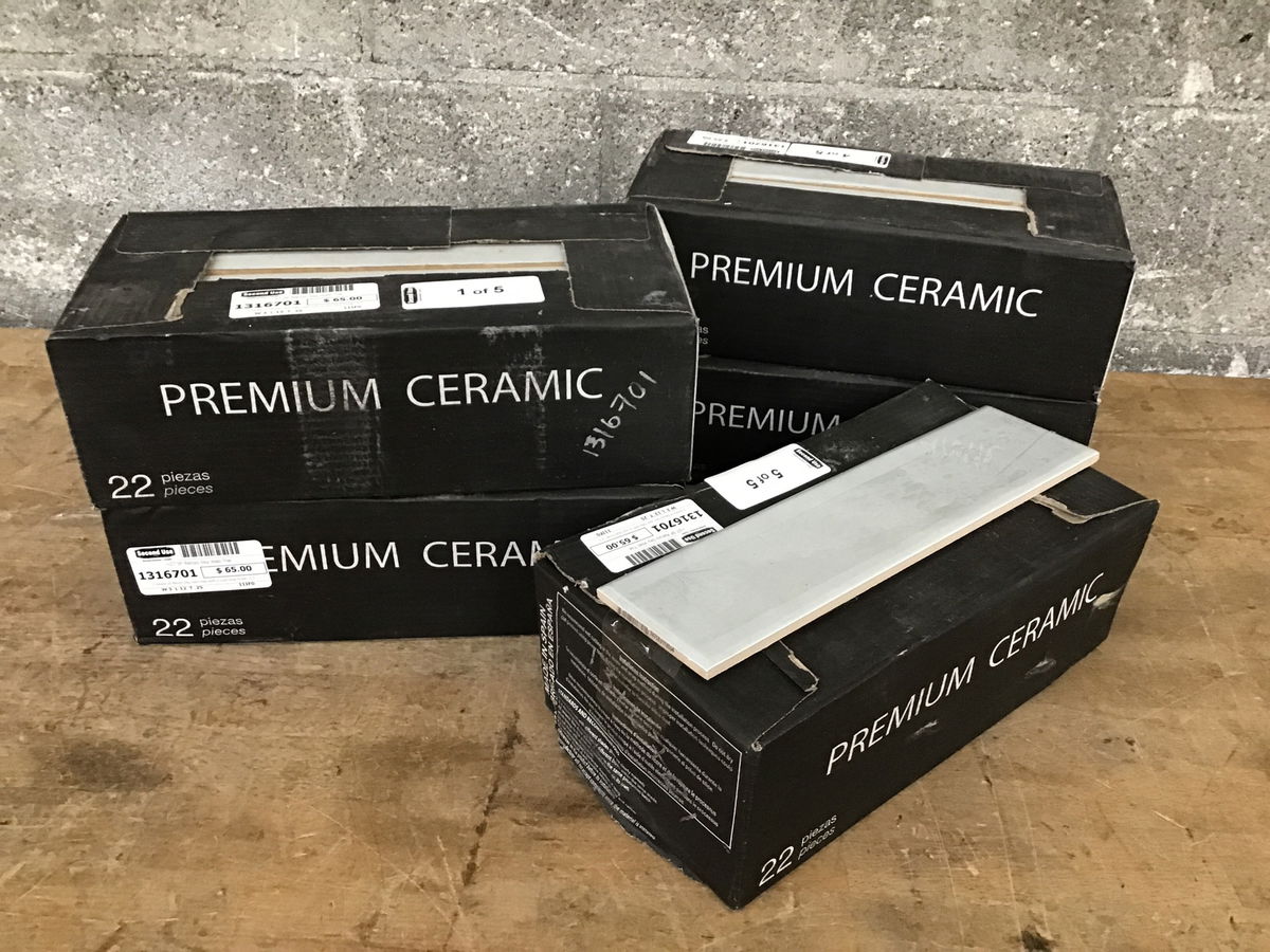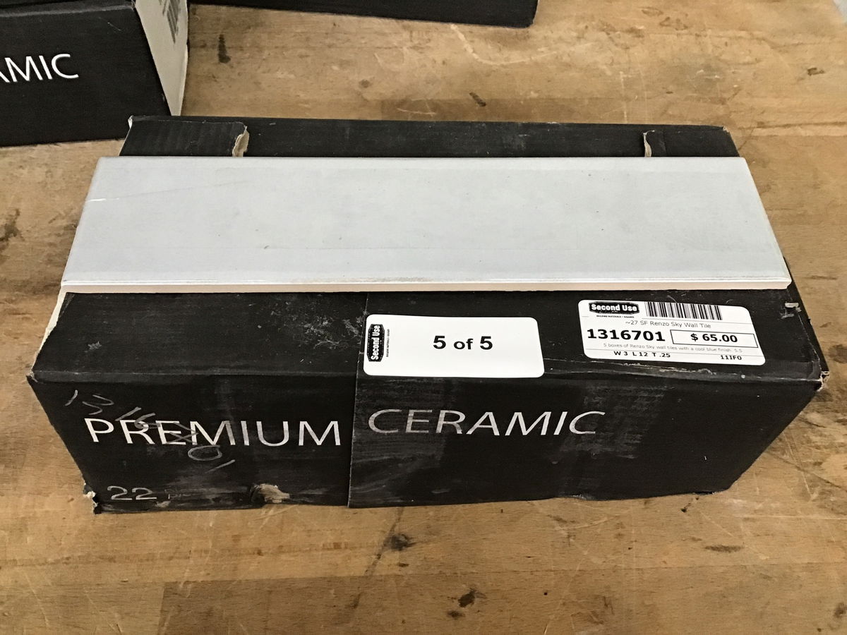5 boxes of Renzo Sky wall tiles with a cool blue finish. 5.5 SF per box for a total of 27.5 SF. Would be a great choice for a backsplash or other small project.