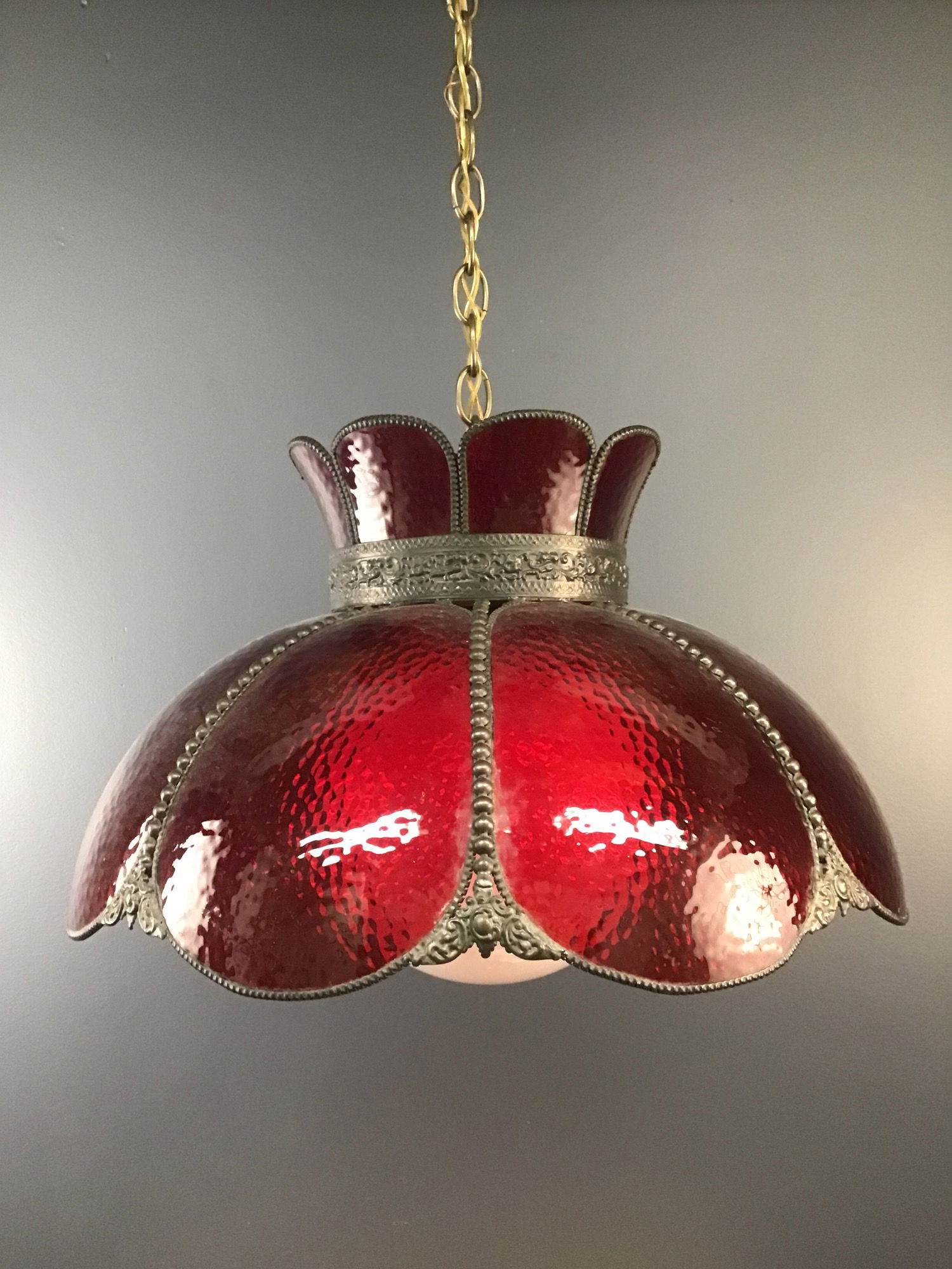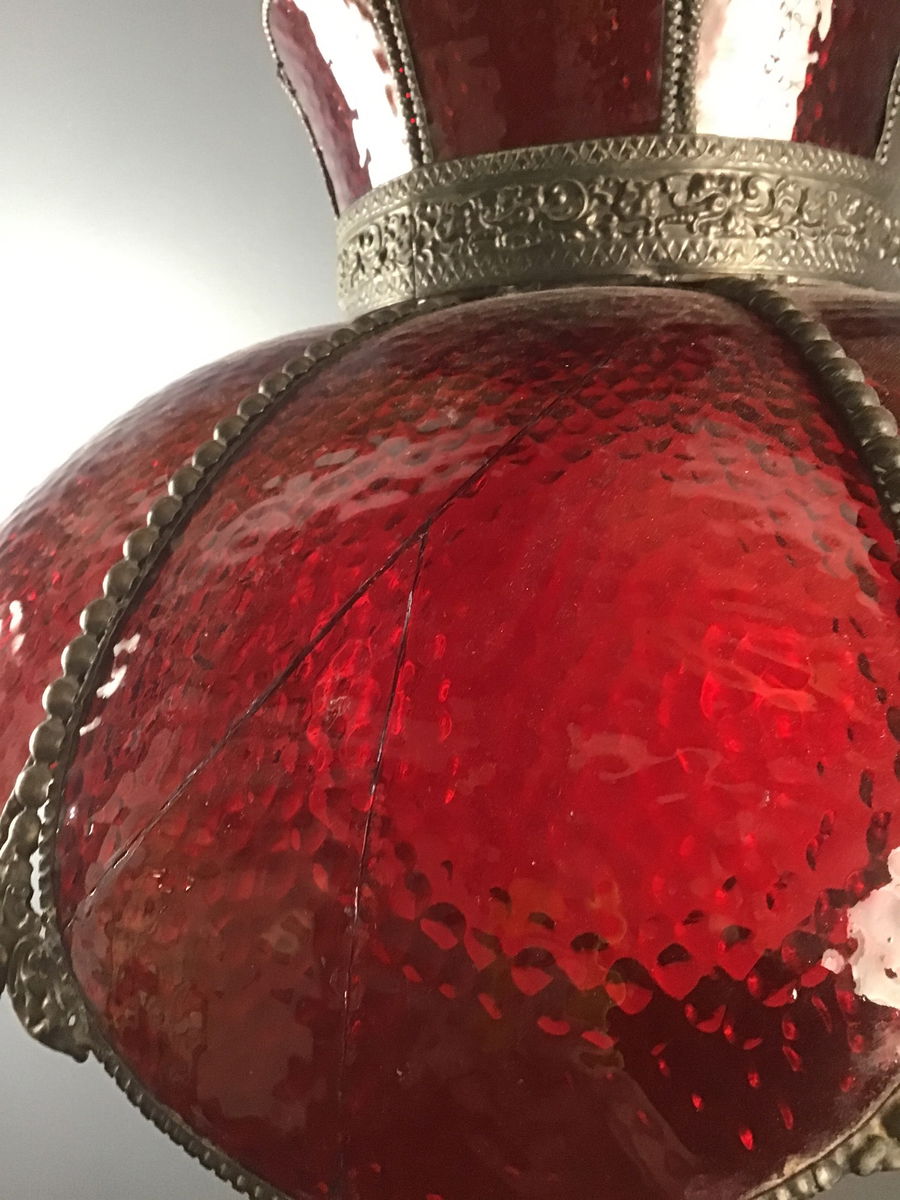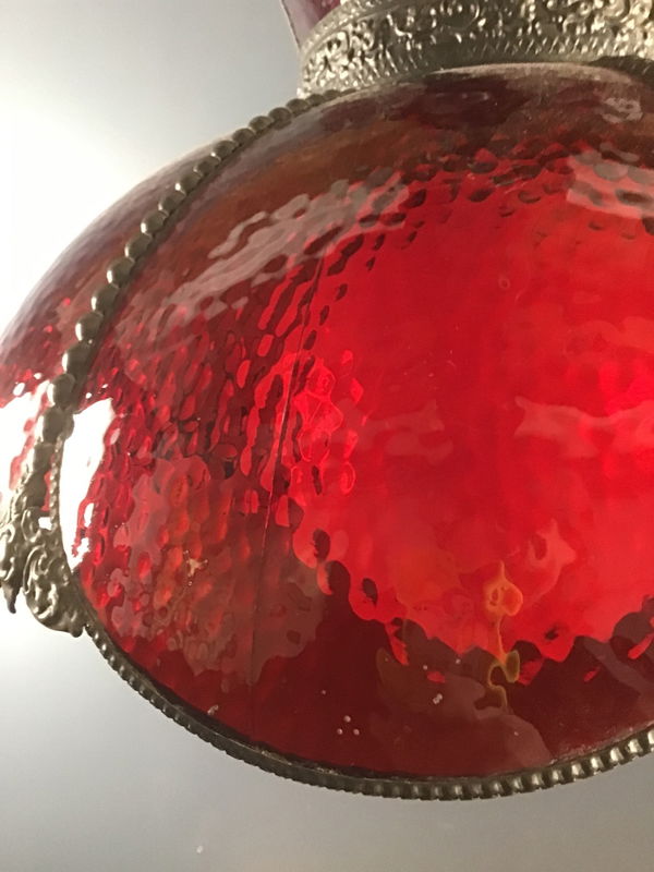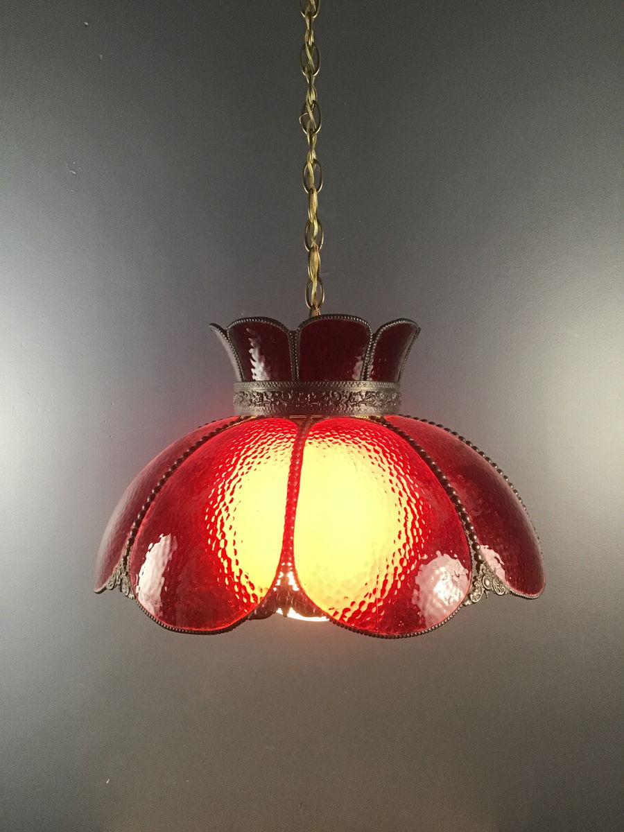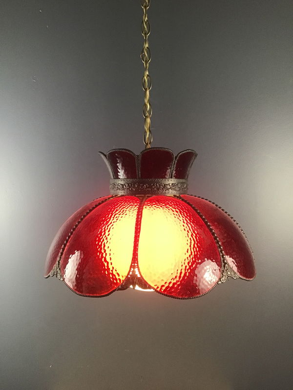 Red acrylic dining light that has been rewired to professional standards, it is a 1980's repro of an older style. Ready to be hard wired. Two of the curved 'petals' have cracks but they are inconspicuous. Come with big white diffuser globe.