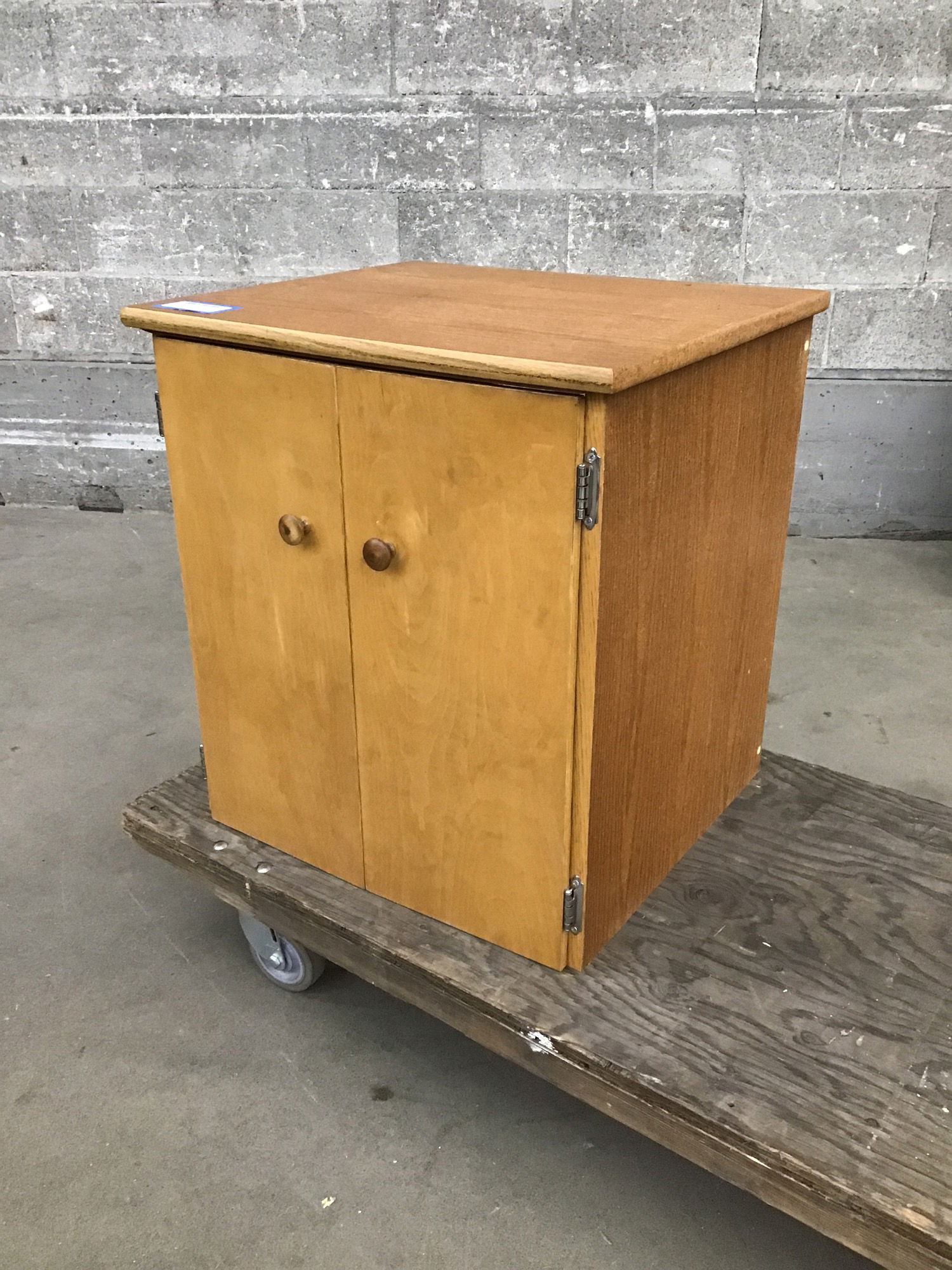 A petite sized cabinet with two doors and 3 interior levels of shelving. This would need some kind of toe kick installed for ease of access, but otherwise is a very solid cabinet.