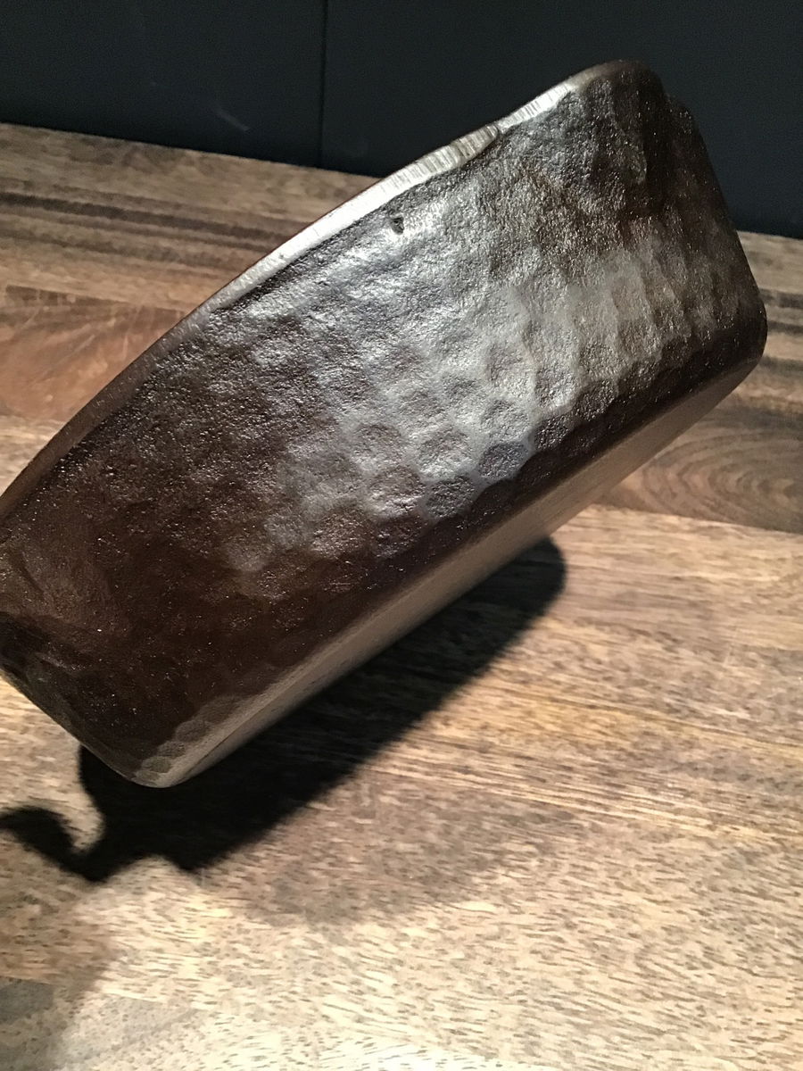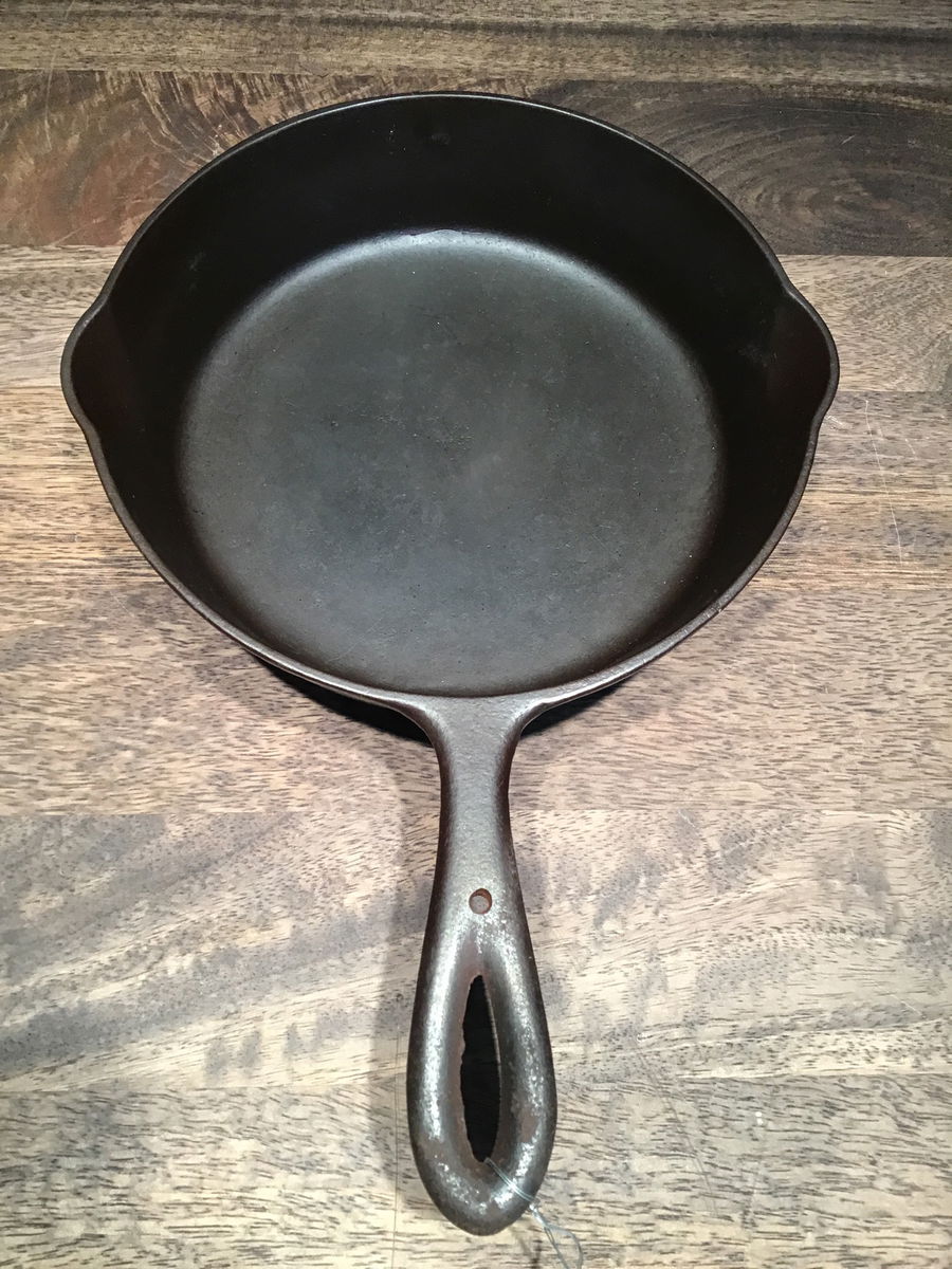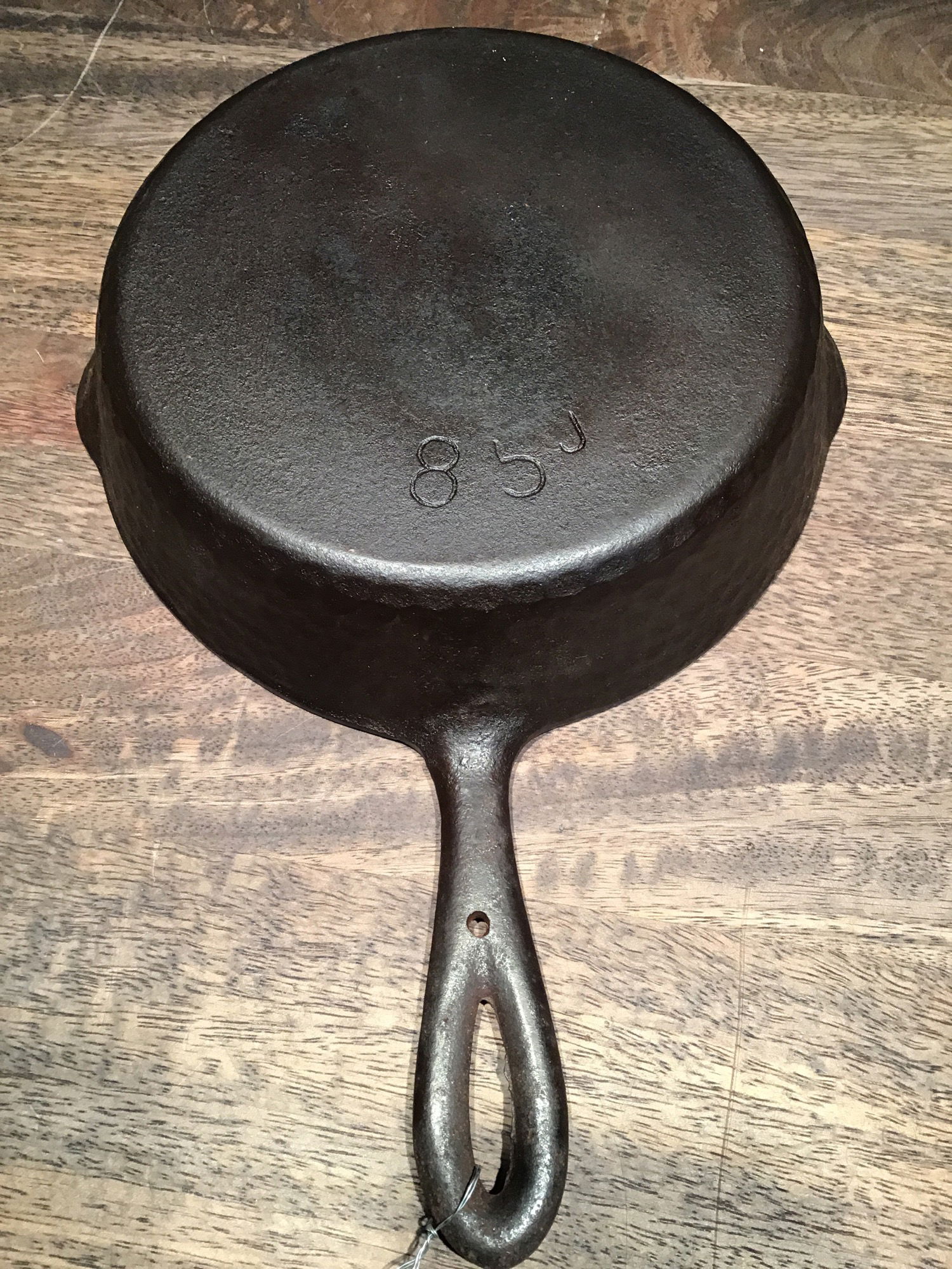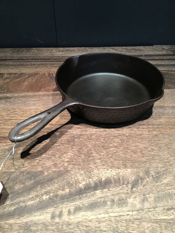 Guessing this restored "hammered" exterior, No. 5 cast iron skillet was made by Chicago Hardware Foundry. Has a less than one business card wobble.