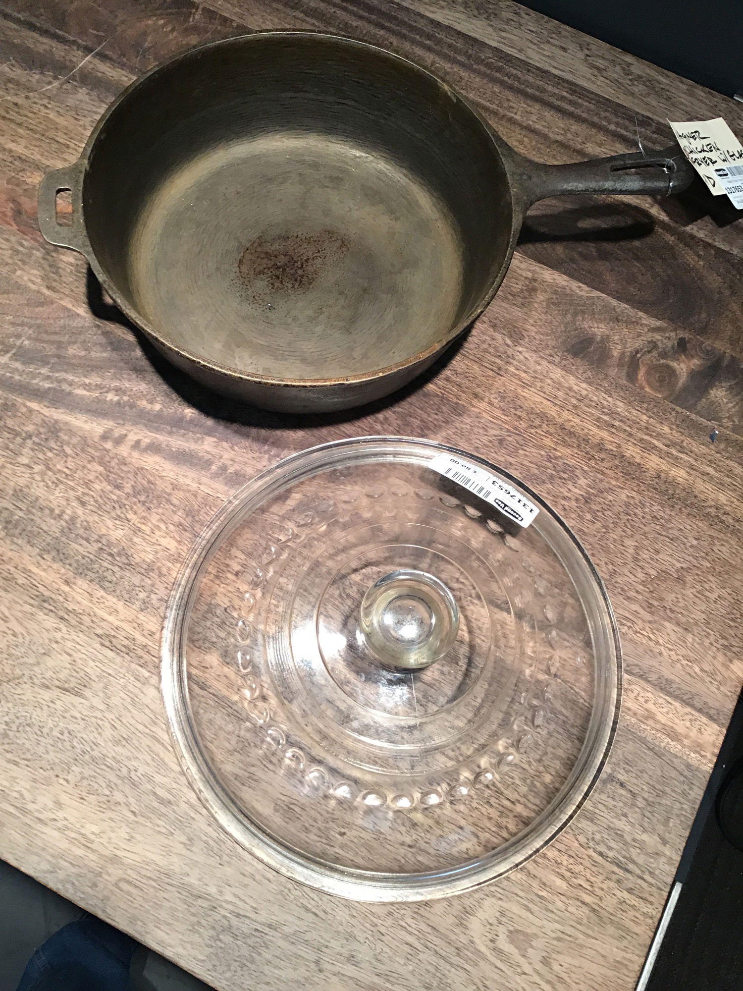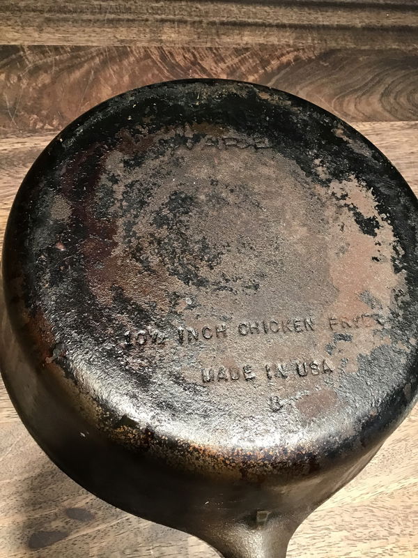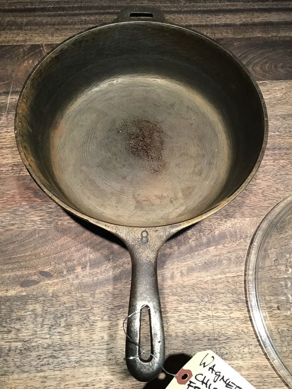 Unrestored Wagner Ware No. 8, "10 1/2 Inch Chicken Fryer" that has a little build up around the exterior and minor surface rust inside but the center feels quite smooth yet and shows original factory polishing swirls. The glass basting lid is not marked, but fits snugly and looks right for a glass Wagner lid, which was often found on chicken fryers. Has a two business card wobble.