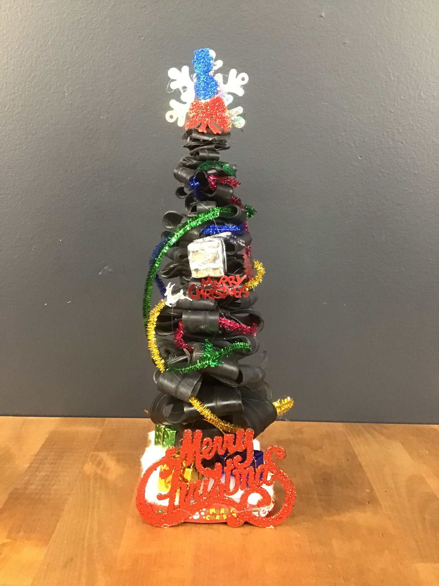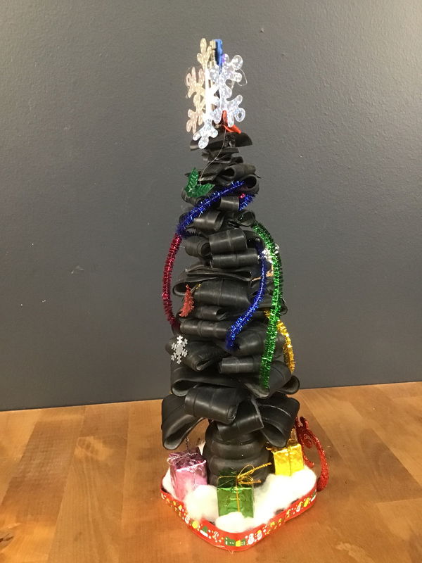A hand made Christmas tree made out of upcycled bicycle inner tubes! The perfect gift for any bicycle enthusiast to bring a little cheer to their living room or work bench!