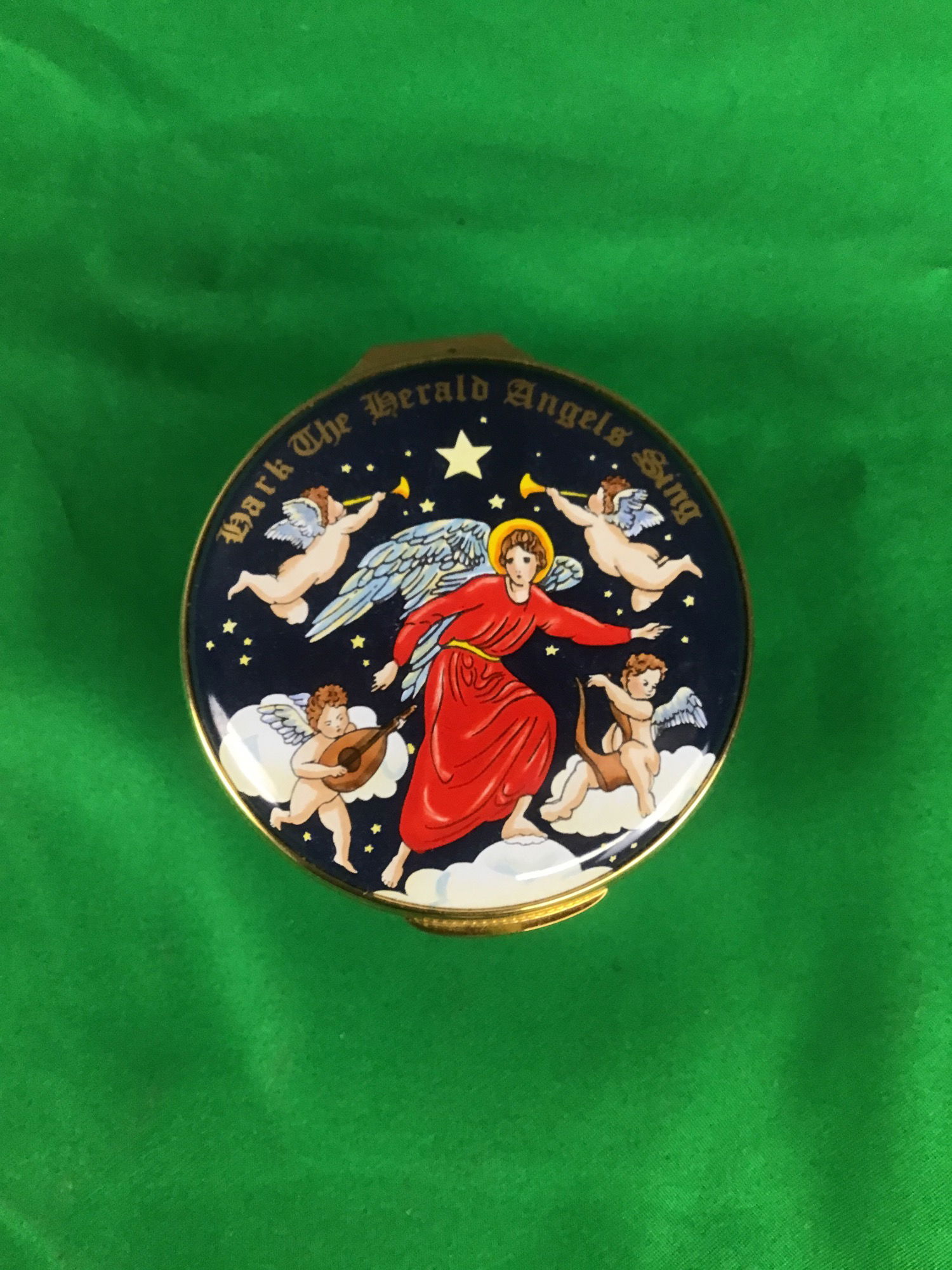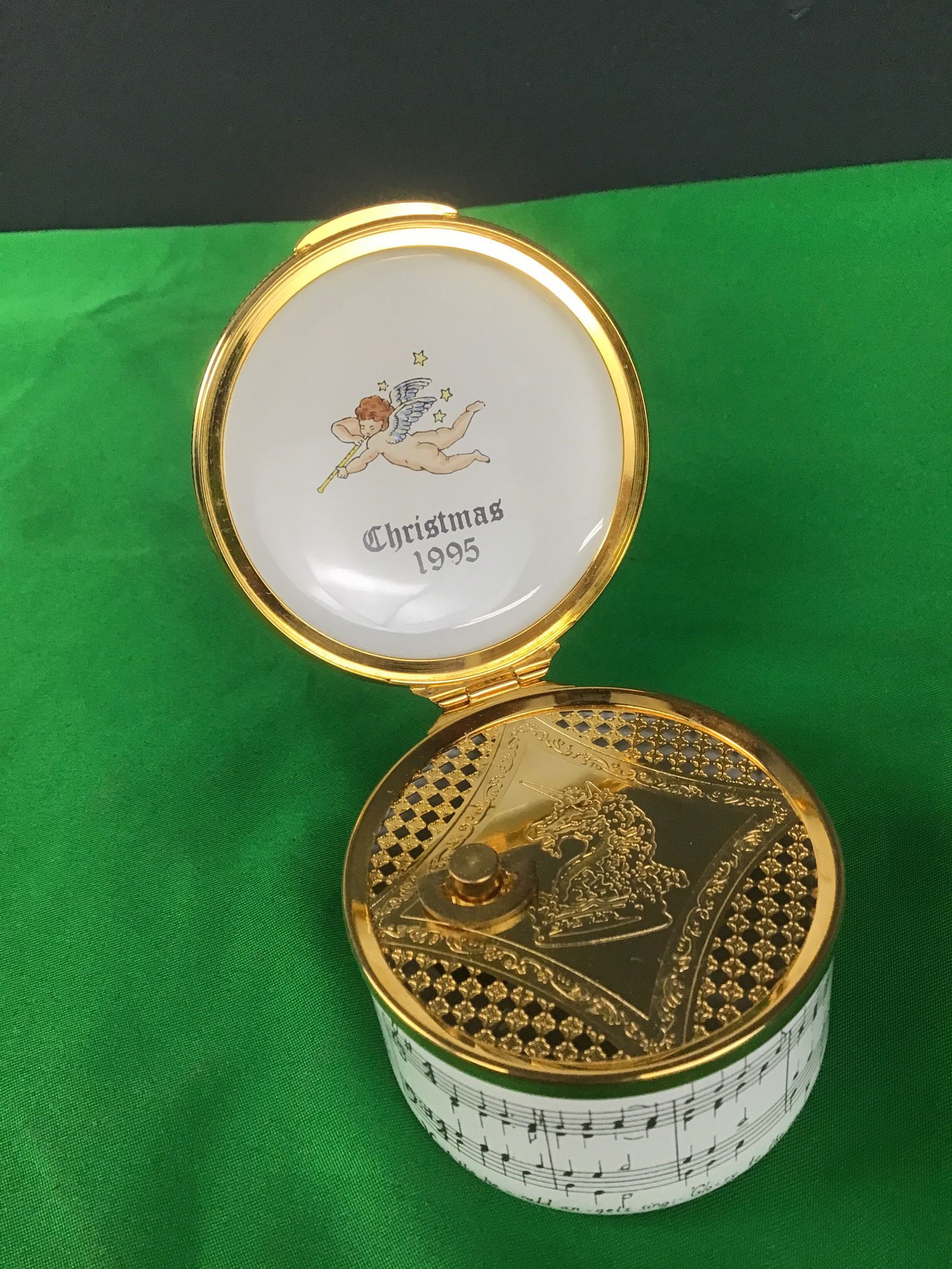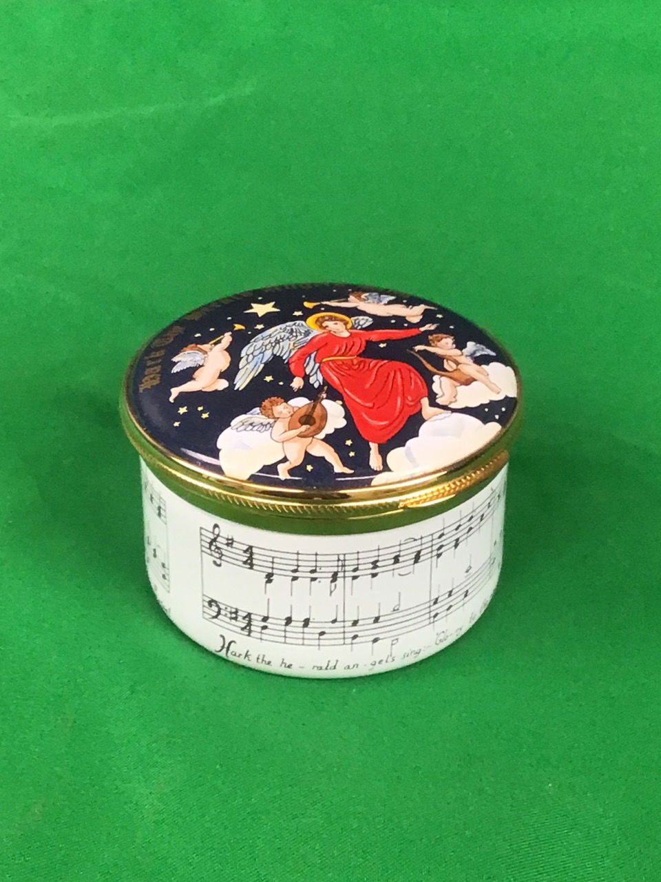 A sweet little music box made by Alaster Enamels for Christmas 1995. It plays the tune of Hark! The Herald Angels Sing. In excellent condition.