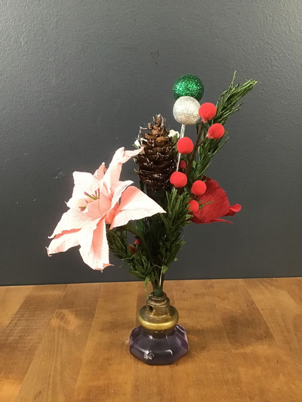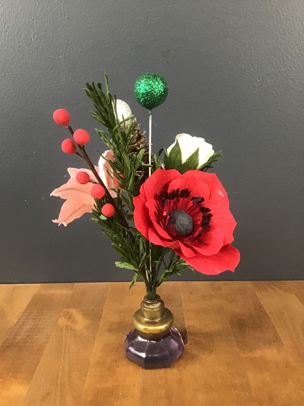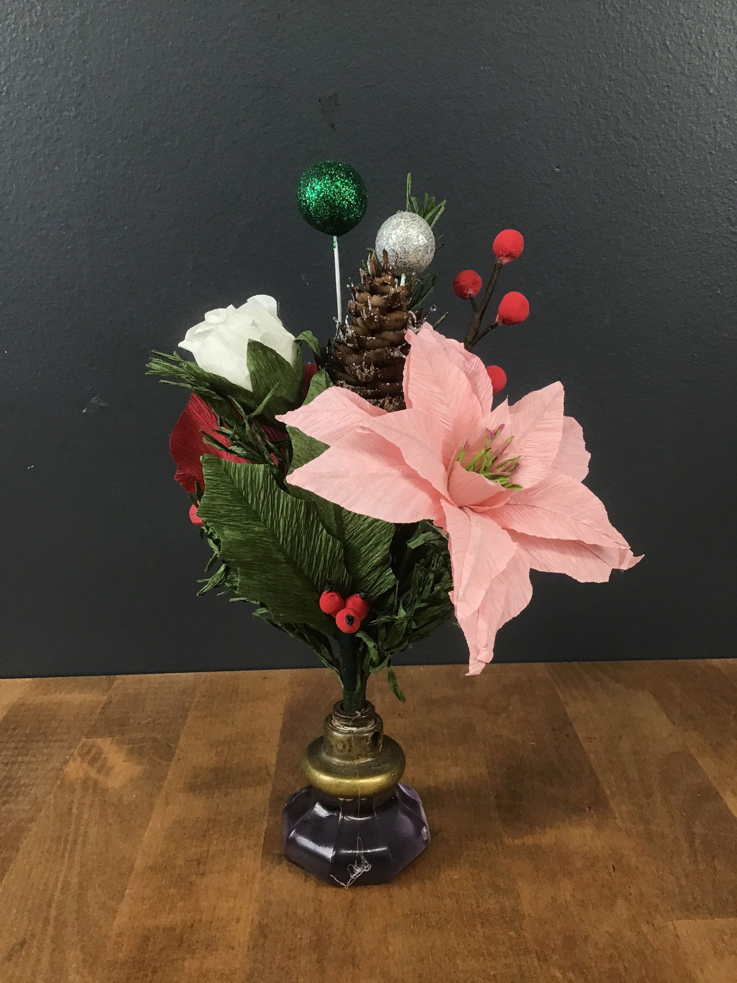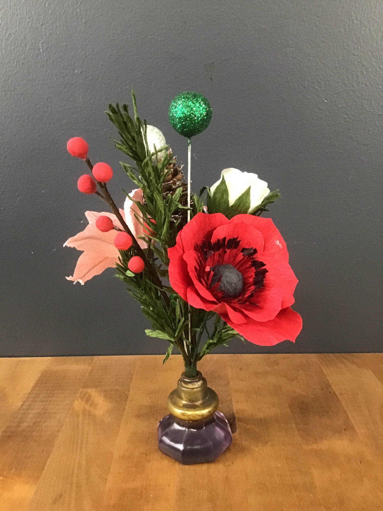 A handmade holiday themed flower arrangement featuring crepe poinsettia, anemone, glittery pinecone, holly, winter berry, pine branches and silver and green sparkly balls in a repurposed antique glass door knob vase! So cute and festive! Hand made by one of our employees!