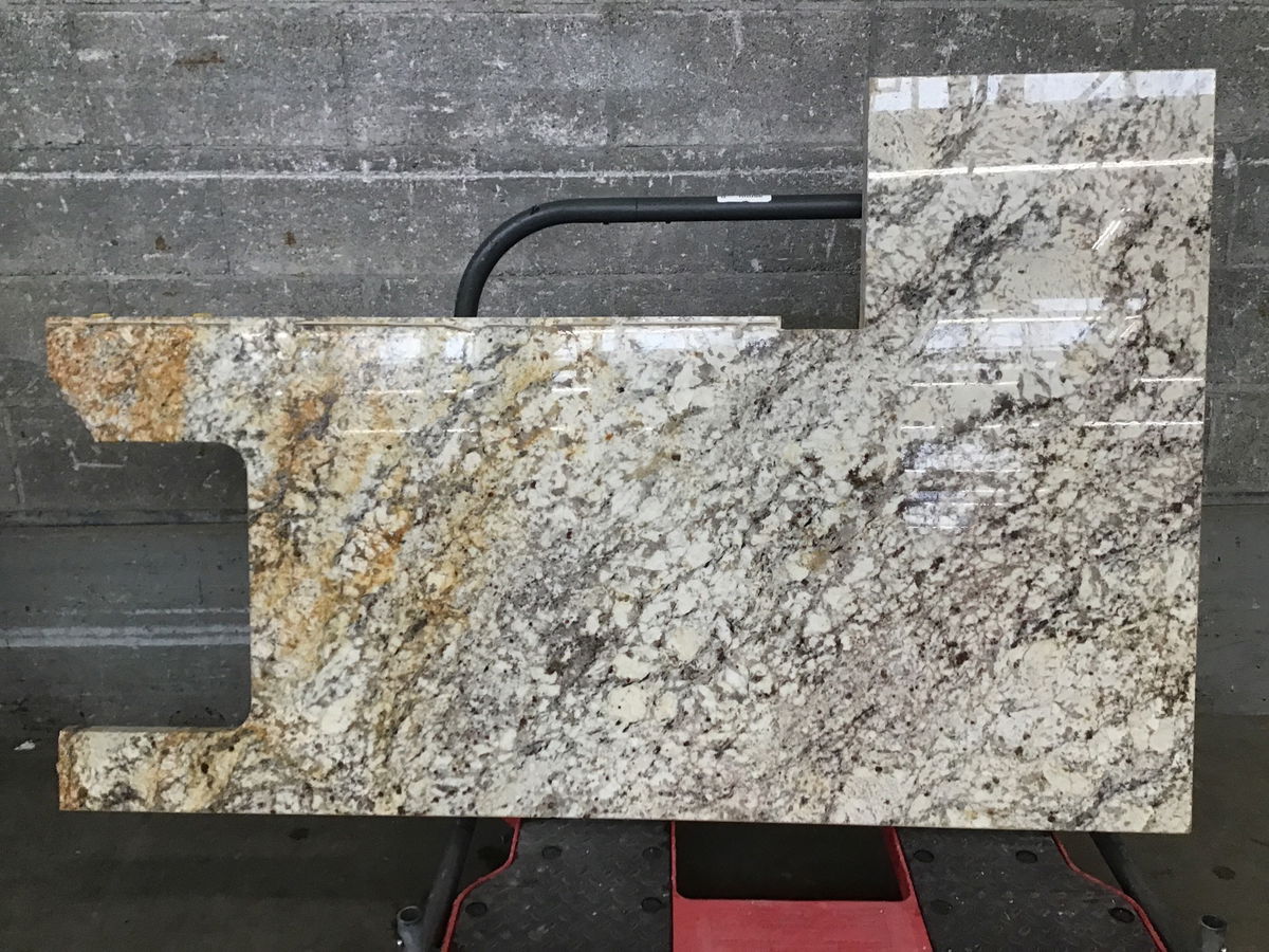 Funky shaped piece of cream toned granite, originally part of a sink base, will need heavy modification to be more user friendly, price reflects. Dimensions reflect usable area.