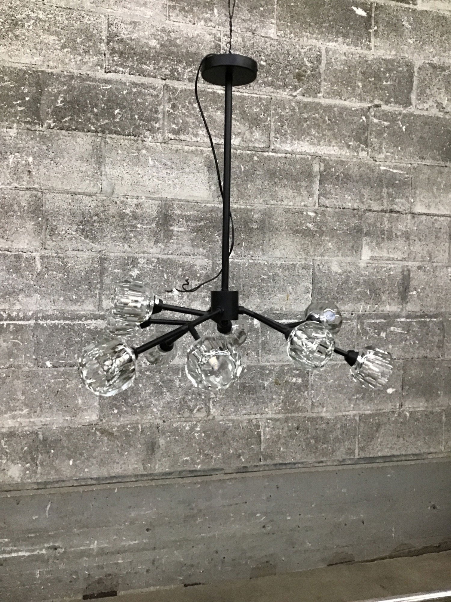 Stylish modern 9-light Sputnik style LED chandelier with chonky beveled glass shades. Almost has an organic look to it. Fantasy-moderne! One shade has a pea-sized chip, but it won't be visible once installed. A very similar model retails for $480 at Lowe's.