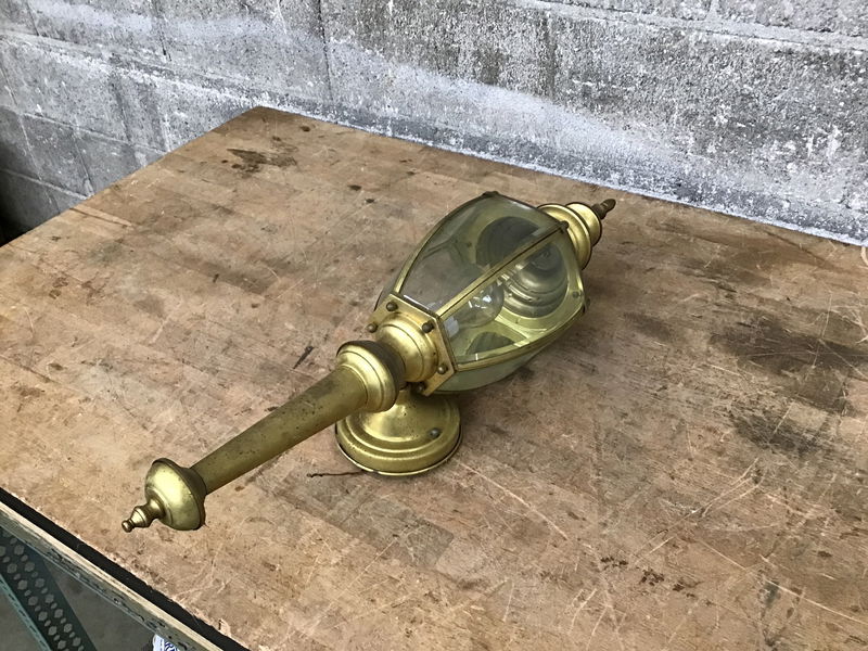 Natural brass finished exterior wall lantern with nice patina. Dimensions are approximate.