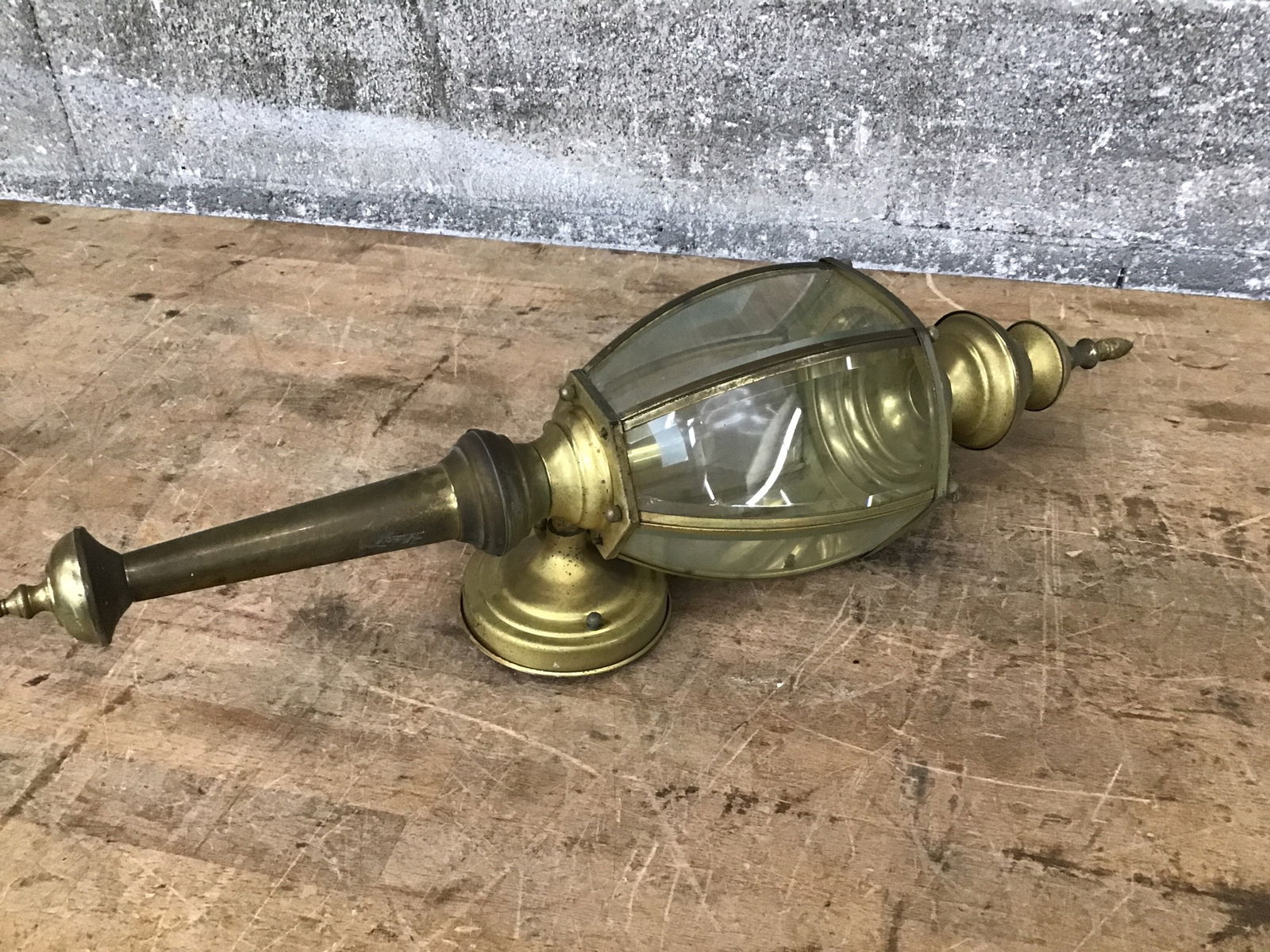 Natural brass finished exterior wall lantern with nice patina. Dimensions are approximate.