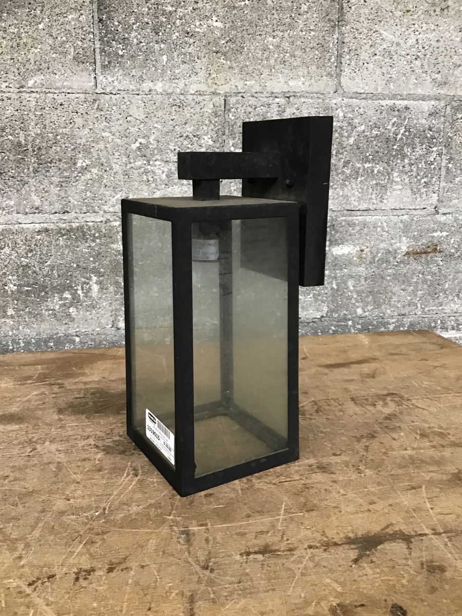 Black finished frame with clear glass, exterior wall light. Has a layer of dust to clean off.