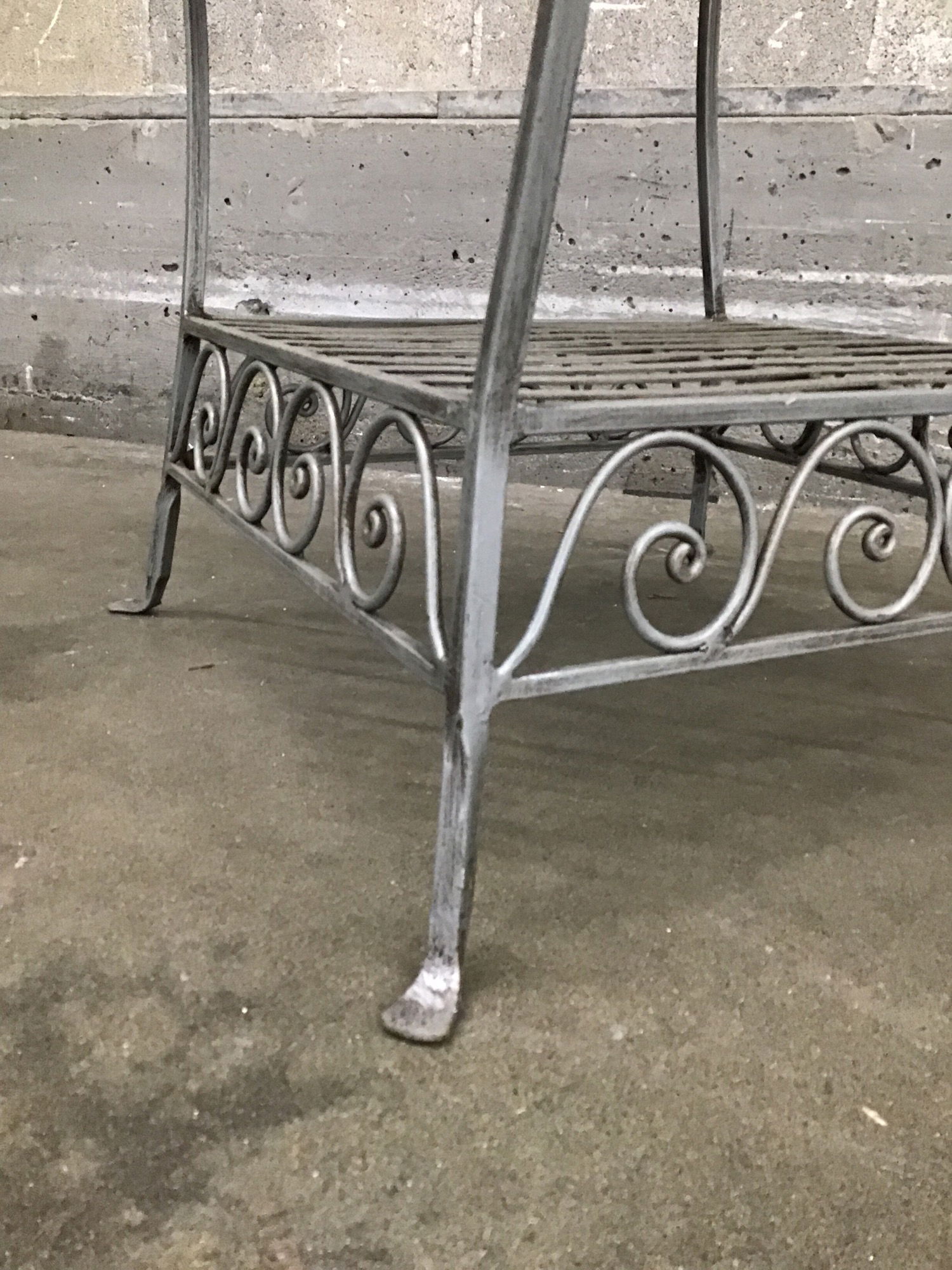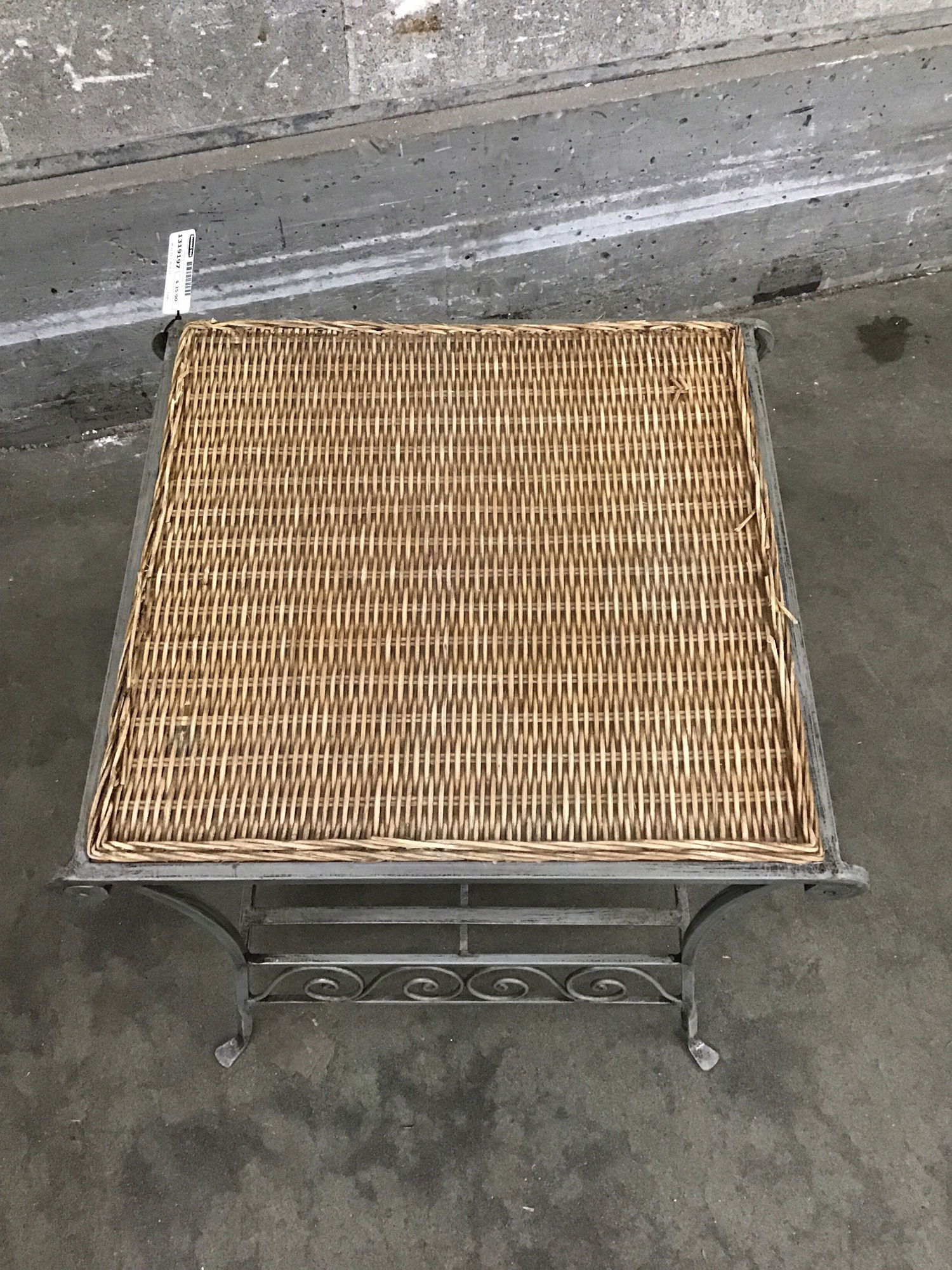 Painted steel with a wicker top in good condition. Adorable feet. We received two of these so check out the other items on this job to see if the second one is still available.