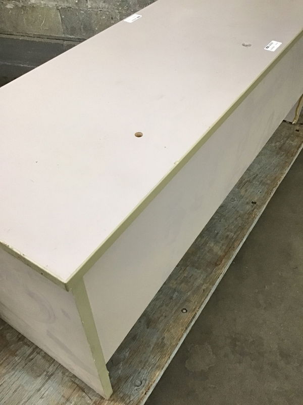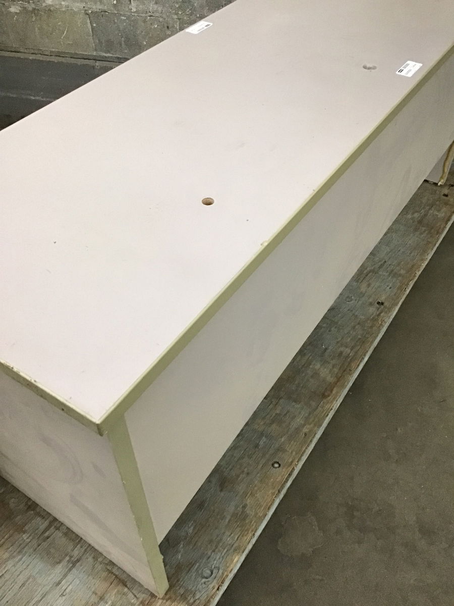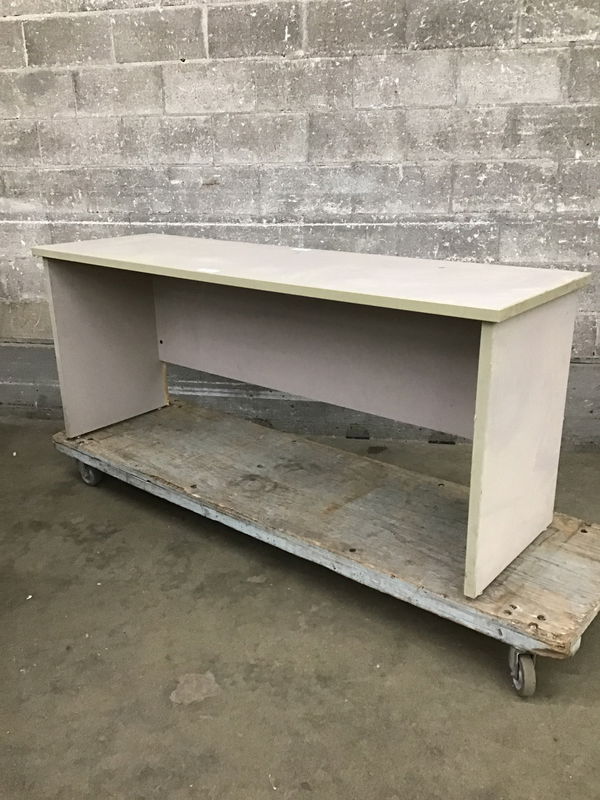 Pretty basic looking work table that is 6' long. There are a couple of small holes drilled into the tabletop, probably for cords.