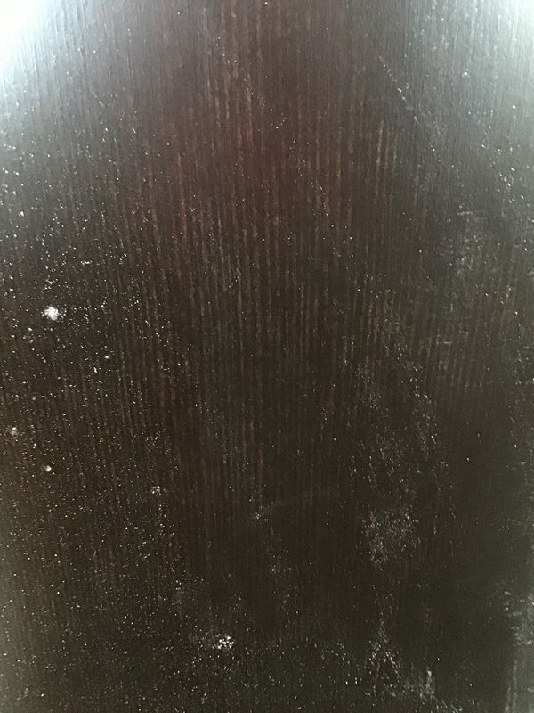 Very dark stained (I'd say black, but you can still see the grain) clear hemlock. Back side is unfinished.