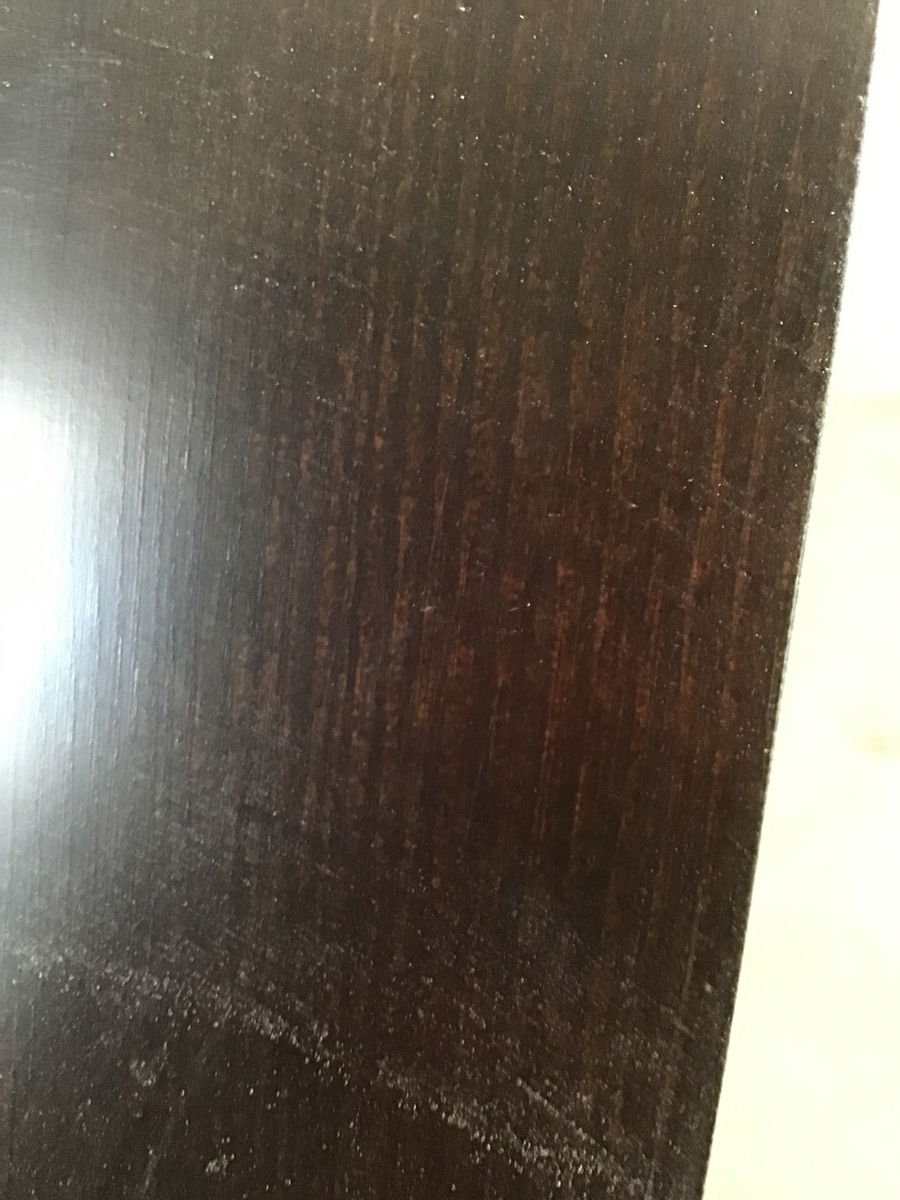 Very dark stained (I'd say black, but you can still see the grain) clear hemlock. Back side is unfinished.
