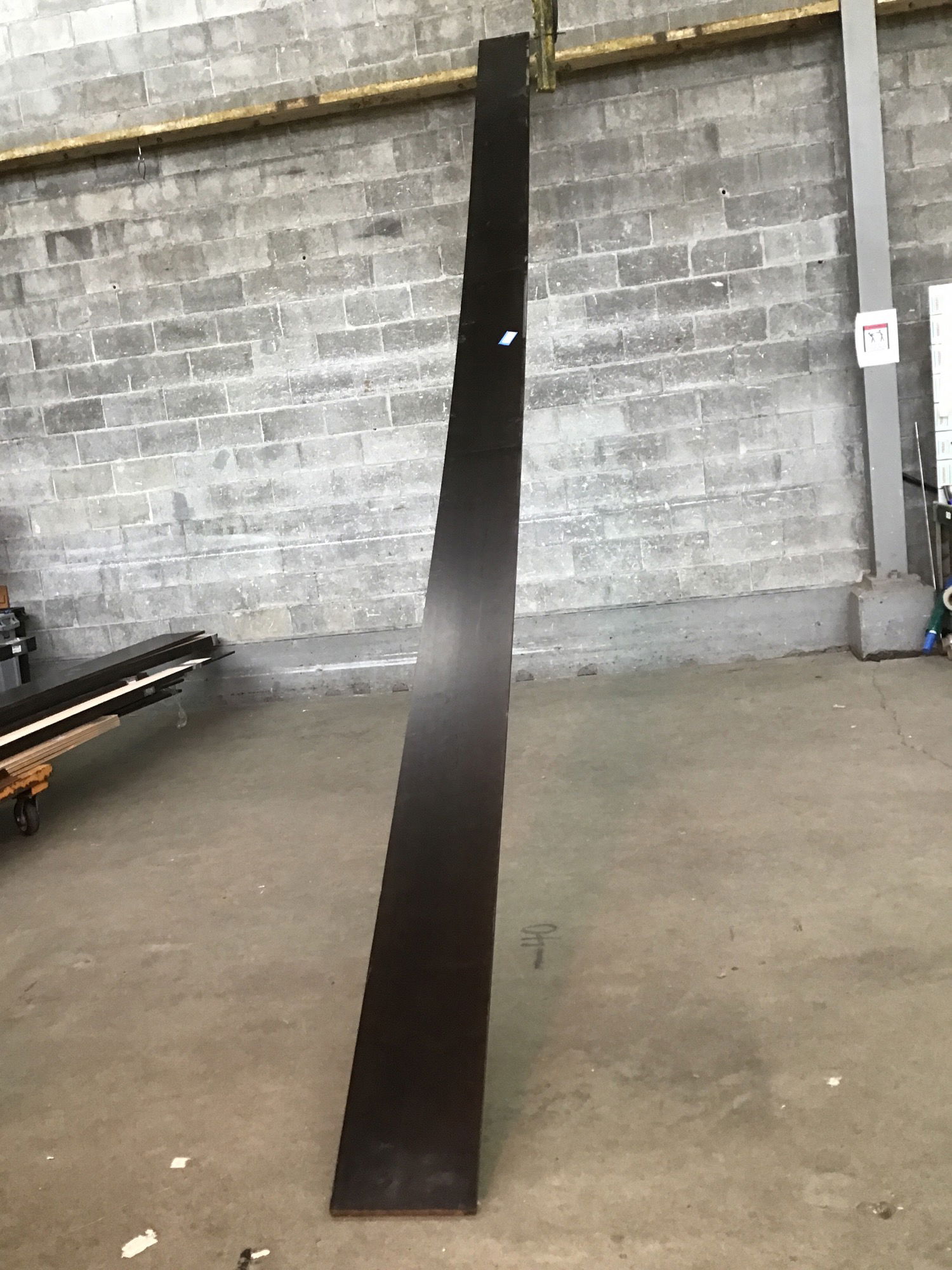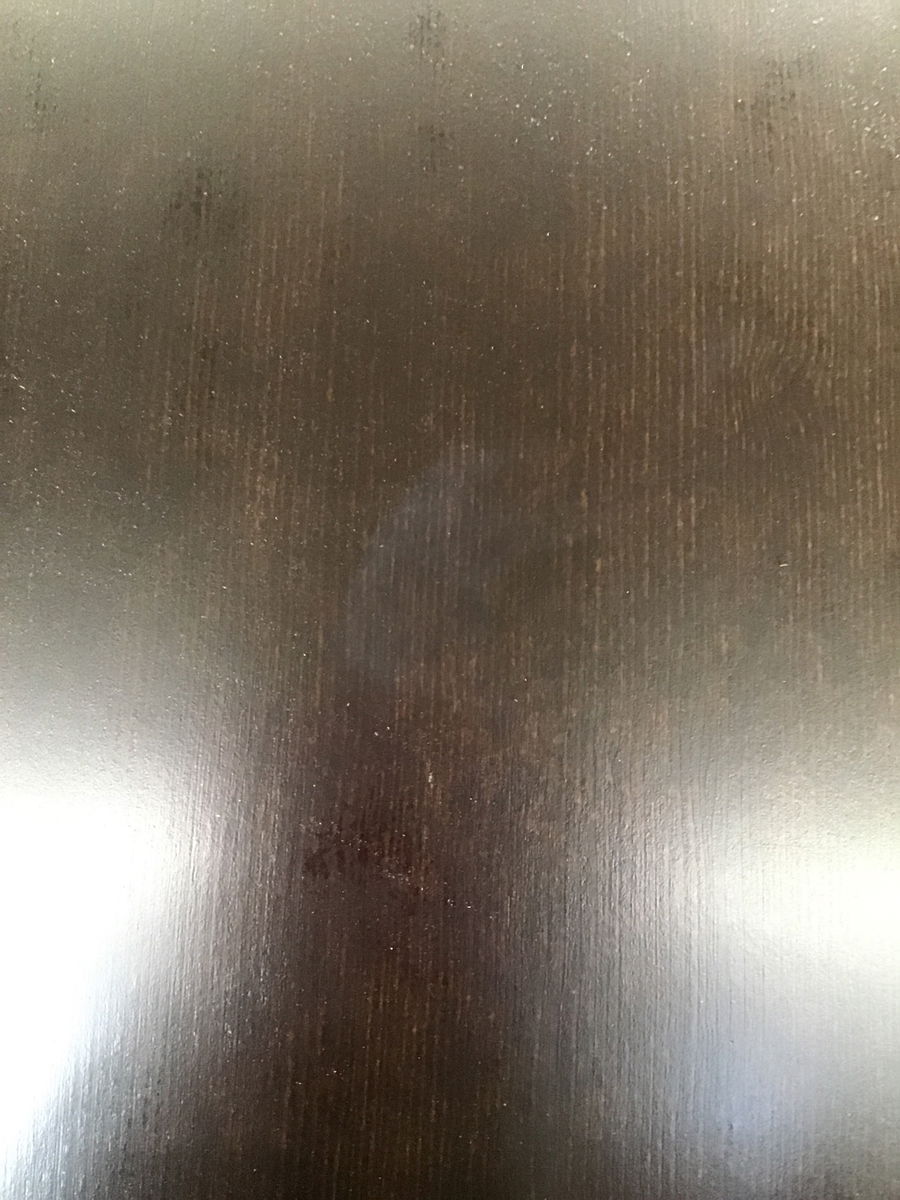 Very dark stained (I'd say black, but you can still see the grain) clear hemlock. Back side is unfinished.