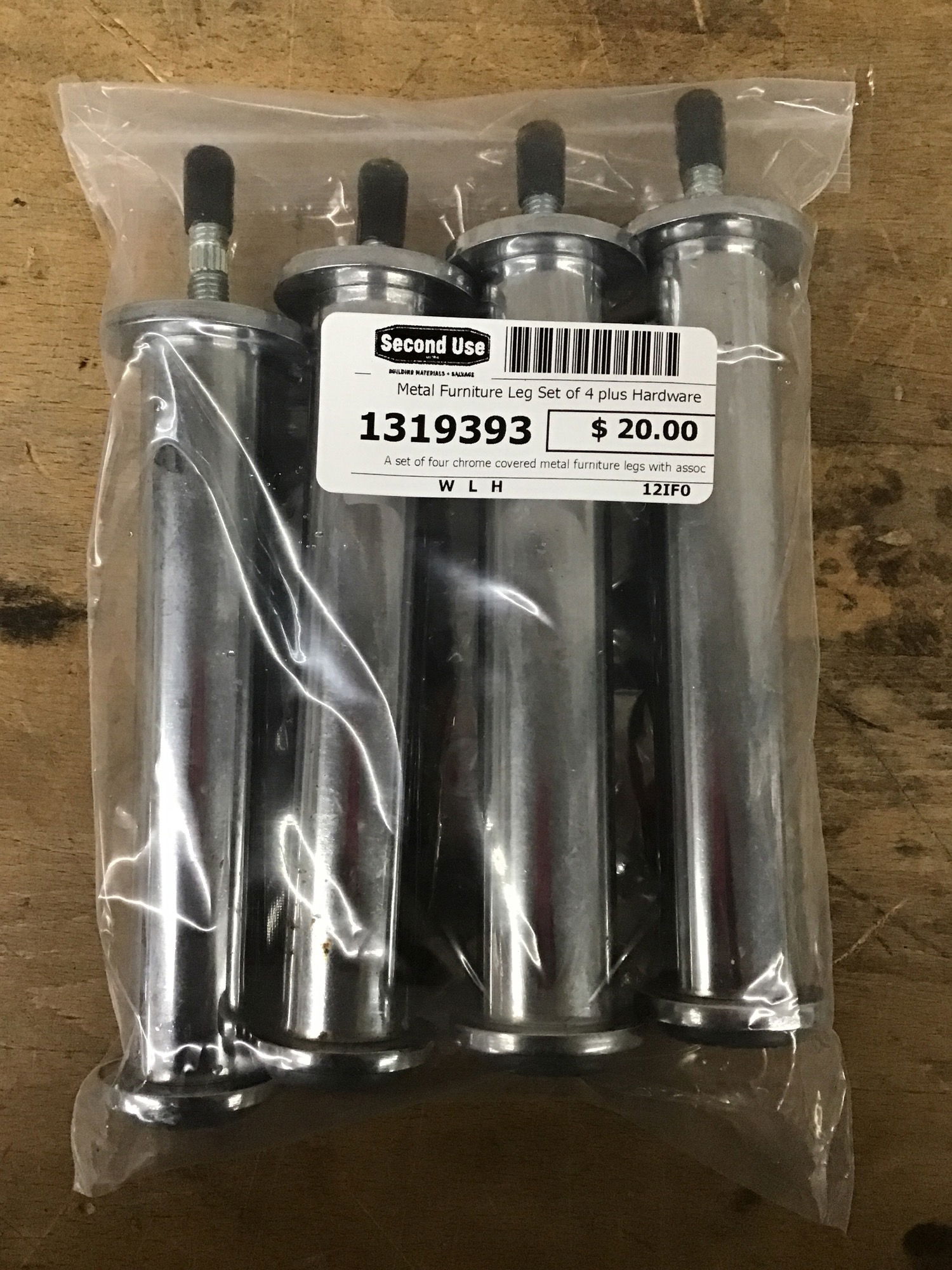 A set of four chrome covered metal furniture legs with associated hardware. Great for anyone needing to finish a DIY project.