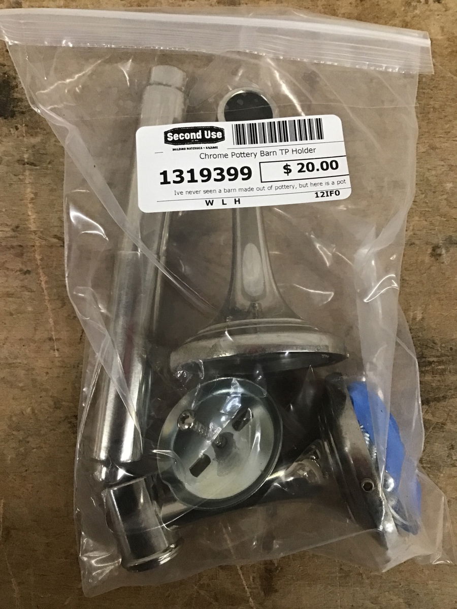 I've never seen a barn made out of pottery, but here is a pottery barn branded TP holder in a sweet chrome finish.