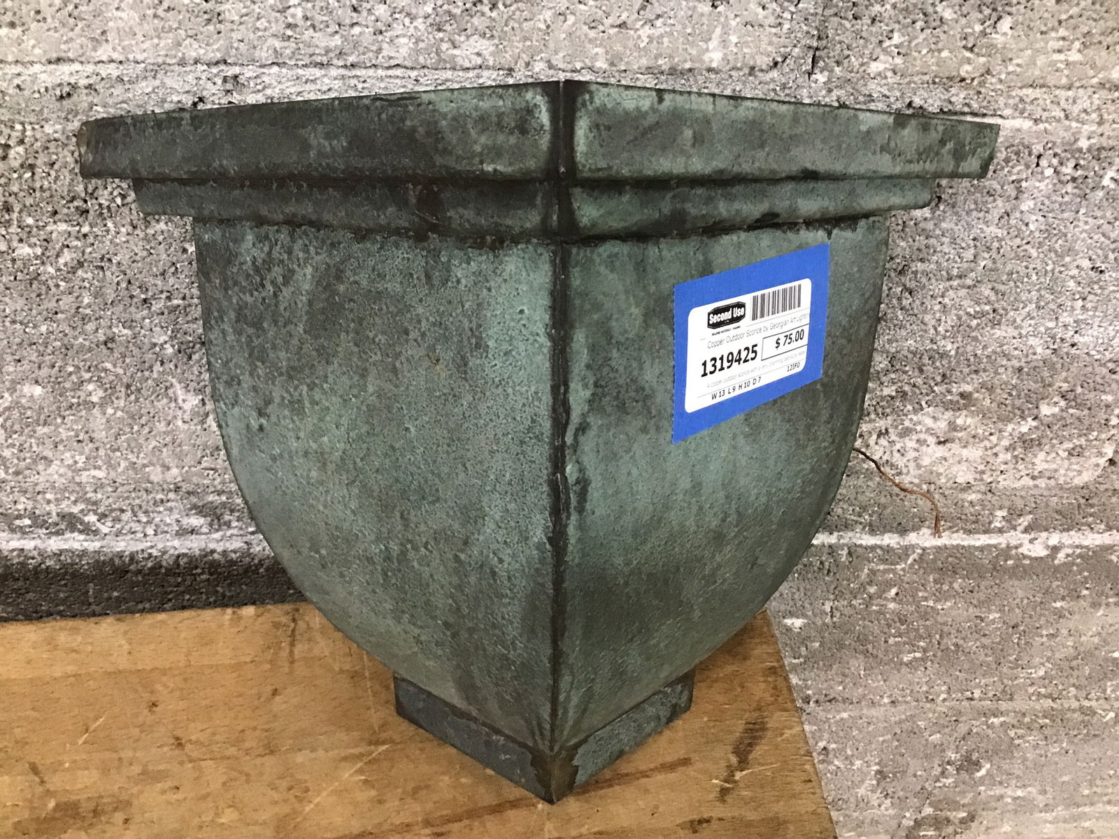 A copper outdoor sconce with a very charming patina by esteemed Georgian Art Lighting. This light has no shade, but is intended to be a flooding directional light. Would be great at highlighting areas of interest on your home.